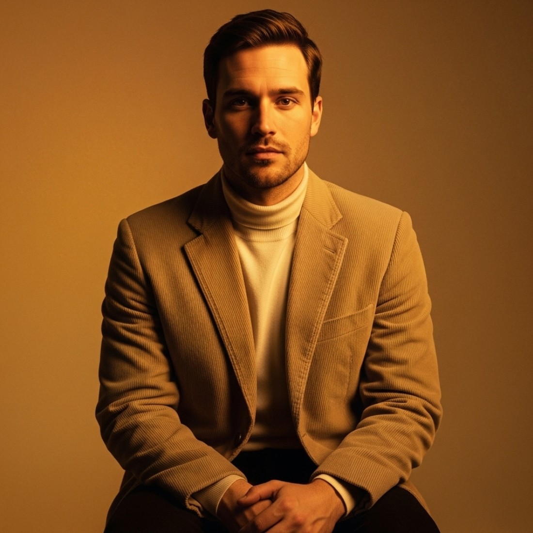 [reference image], studio shot against amber to honey yellow gradient backdrop, tan corduroy jacket, cream turtleneck, hands in lap seated position, warm golden tones, soft wraparound lighting, vintage-inspired sophistication, intimate composition, 85mm lens