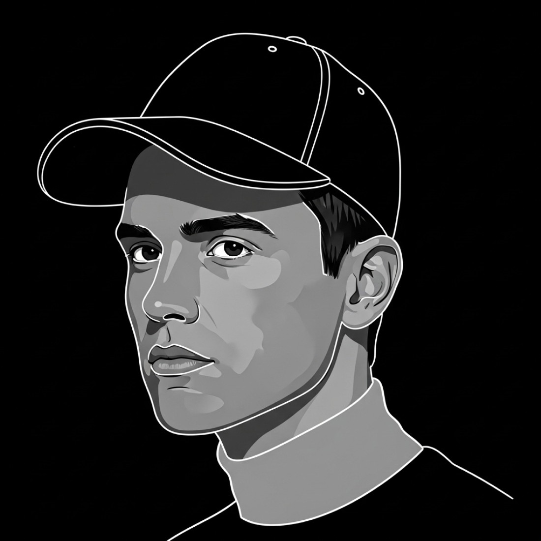 [reference image], hand-drawn minimalist portrait, solid black background, white outline for facial features, dark gray baseball cap worn backward, light gray turtleneck, unconventional angle showing just portion of face and profile, abstract minimalist approach, striking composition with limited elements