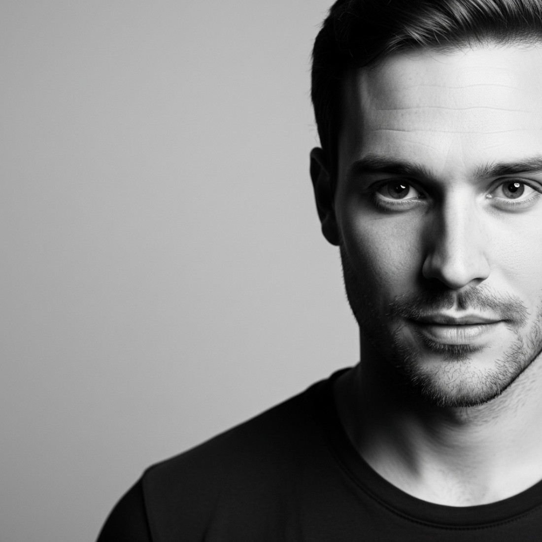 [reference image], monochrome black-and-white close-up portrait, cropped just above the shoulders, intense eye contact, soft key light from the left, subtle catchlight reflections, timeless editorial intimacy, clean background, 85mm lens