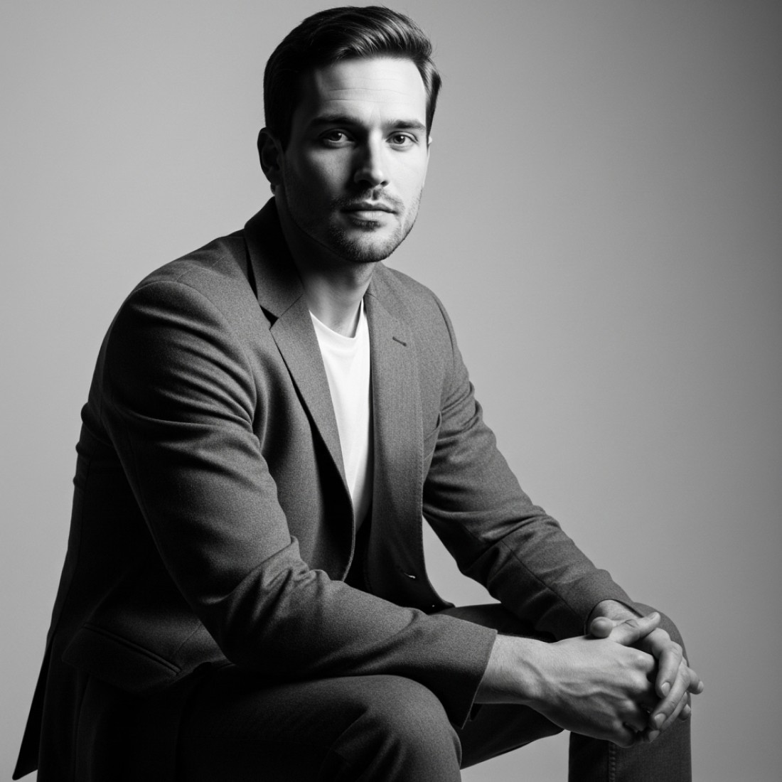 [reference image], monochrome black-and-white half-body portrait, subject seated and turned slightly three-quarters toward light, hands clasped loosely in lap, controlled shadow falloff, calm sculptural presence, 50mm lens