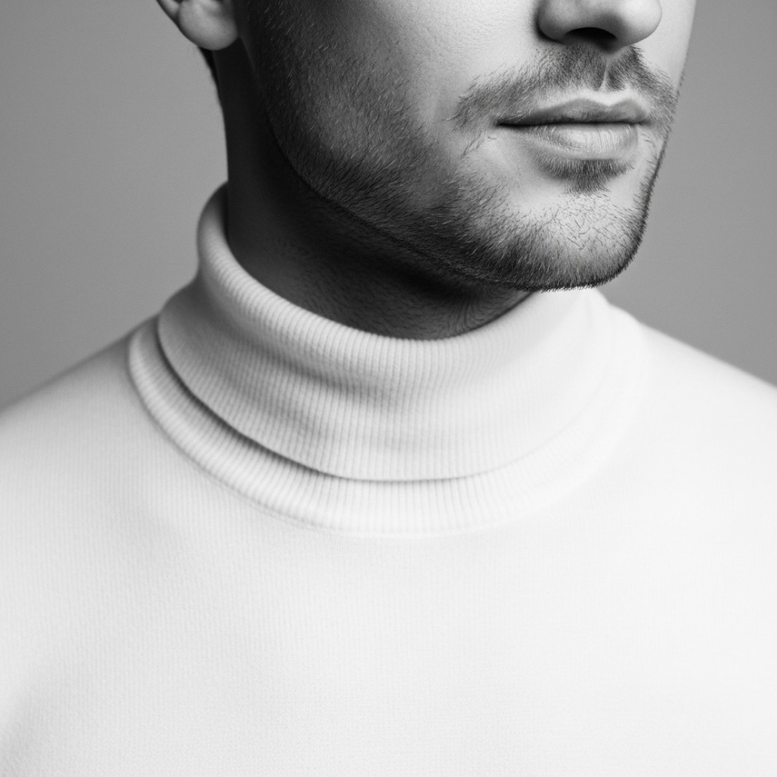 [reference image], monochrome black-and-white tight close-up of the same man wearing a white cashmere turtleneck sweater, cropped at lower face and collar, shallow depth of field, textured fabric and skin detail, intimate fine-art tone, 85mm macro lens