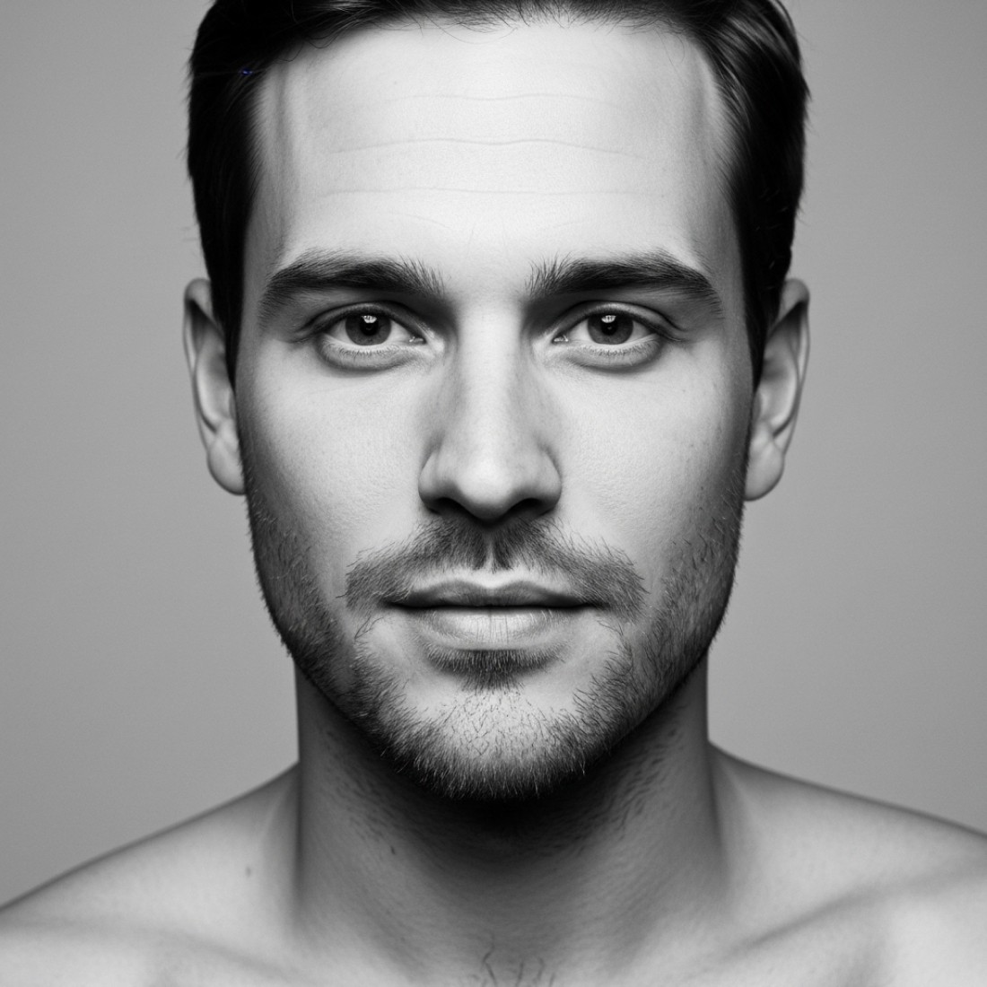 [reference image], black-and-white portrait captured from above, subject reclining slightly backward, eyes meeting lens, creative composition with controlled highlights and rich midtones, modern artistic editorial mood, 50mm lens