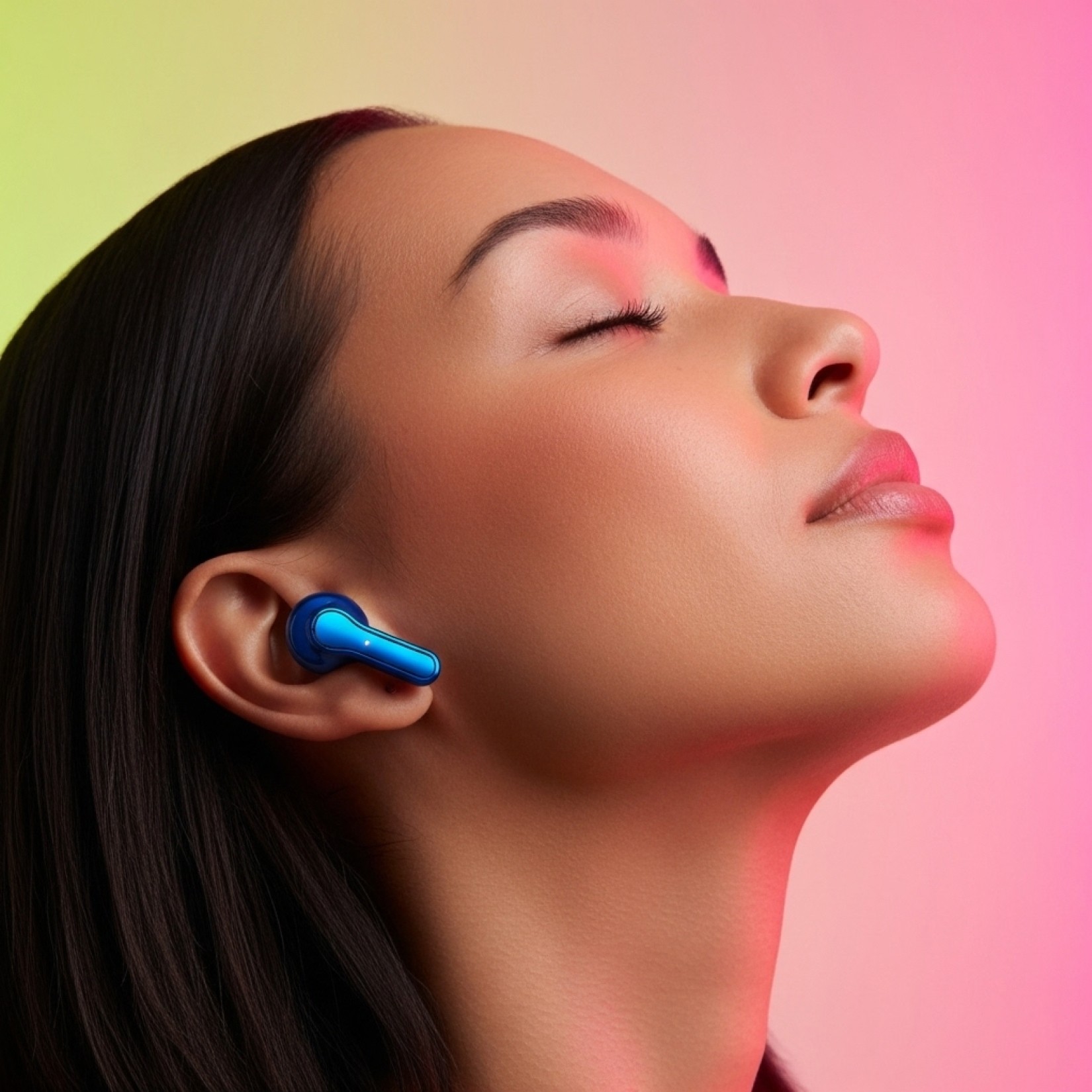 [Reference image], confident female model wearing blue earbuds, electric lime and hot pink gradient background, dynamic pose, bold lifestyle photography