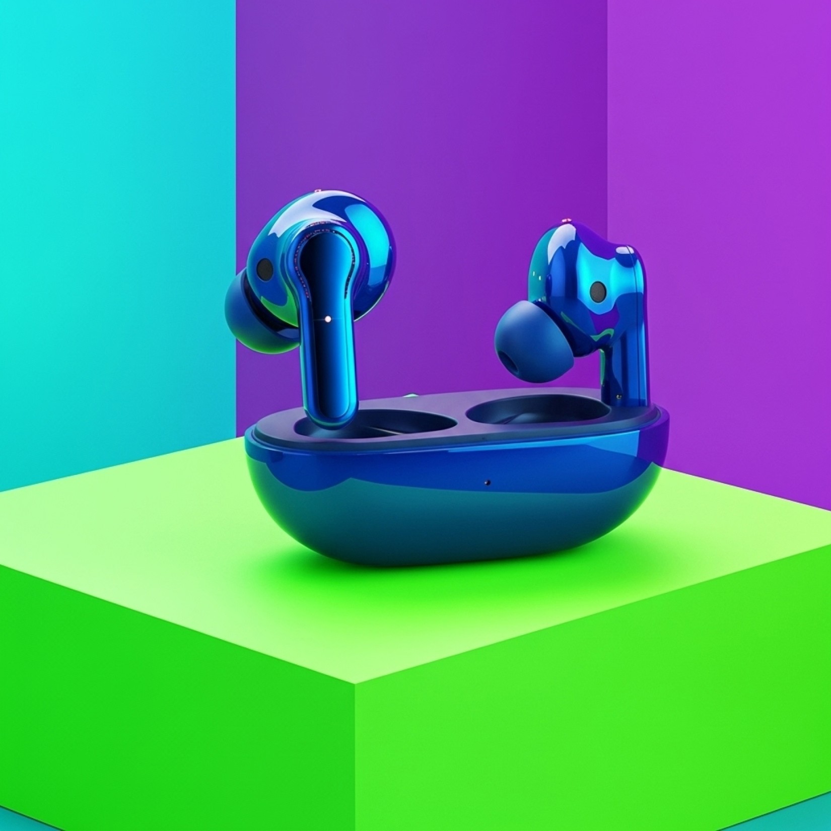 [Reference image], blue earbuds on neon green geometric base, electric purple and turquoise gradient walls, contemporary tech aesthetic