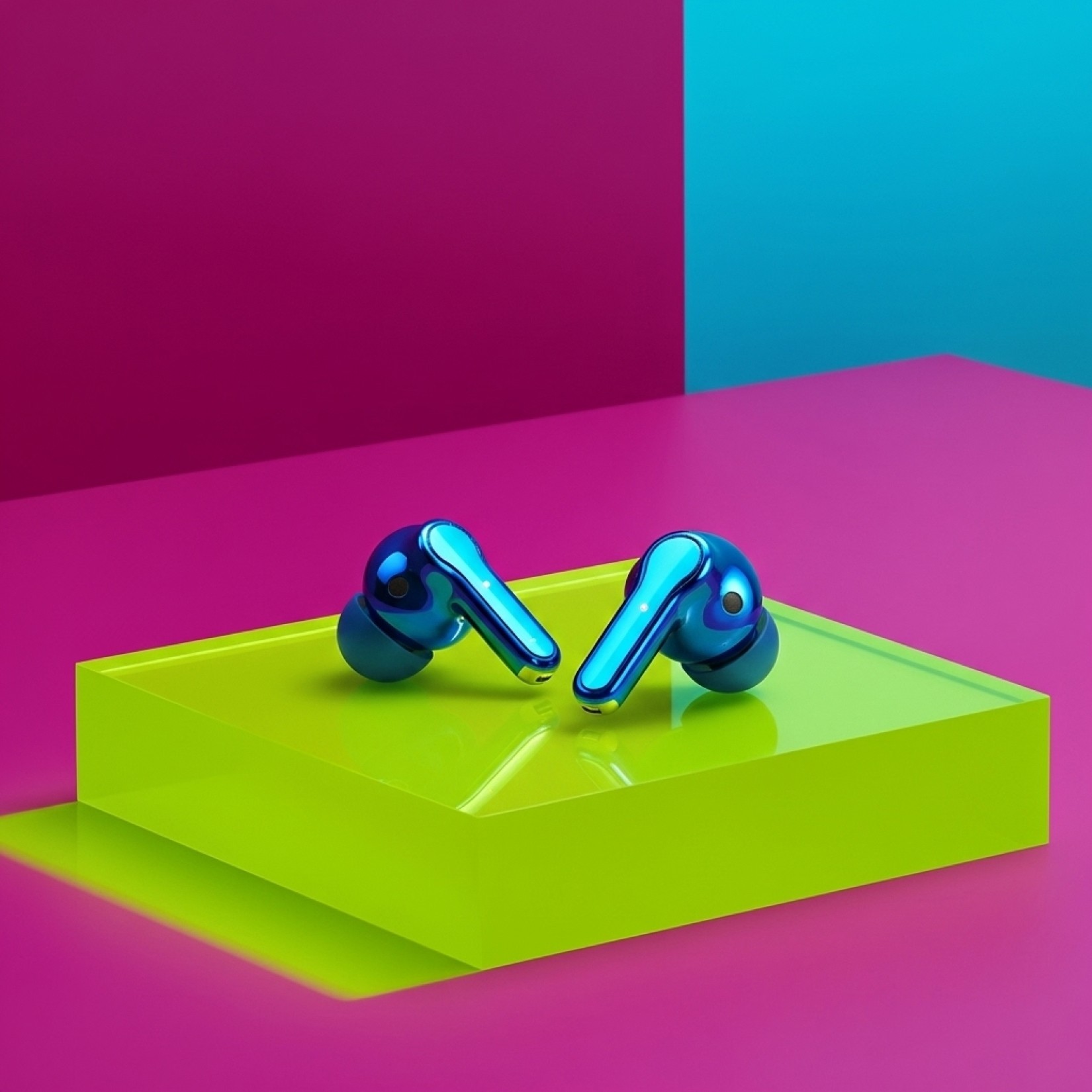 [Reference image], blue earbuds on electric lime green acrylic pedestal, hot magenta and cyan gradient backdrop, futuristic aesthetic, bold tech campaign lighting