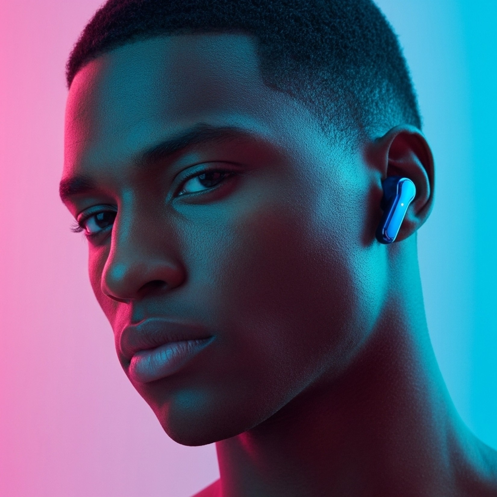 [Reference image], modern male model wearing blue earbuds, neon pink and cyan gradient environment, tech lifestyle campaign, vibrant contemporary aesthetic