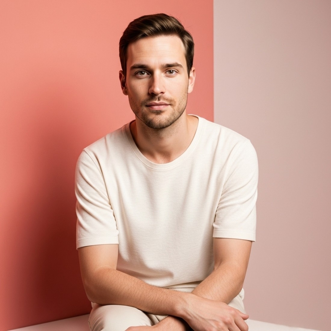 [reference image], portrait against coral to blush gradient studio background, off-white short-sleeve shirt, sitting barefoot on white platform, artistic minimalism, soft daylight feel, contemporary human warmth, 85mm lens