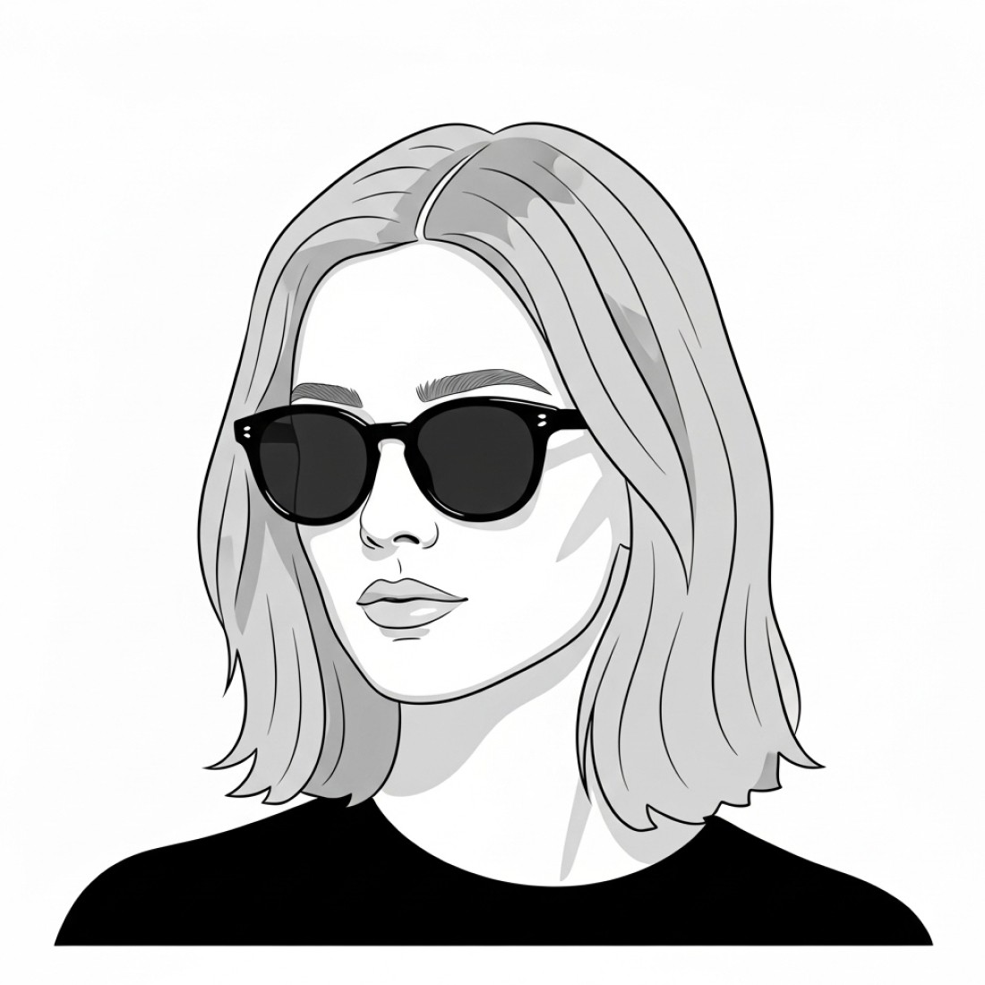 [reference image], hand-drawn minimalist monochrome portrait, white face with clean outlines, solid light gray fill for shoulder-length hair with slight texture, solid black fill for fashionable sunglasses, simplified softer facial features, pure white background, wearing black top, three-quarter view, subtle line weight variations