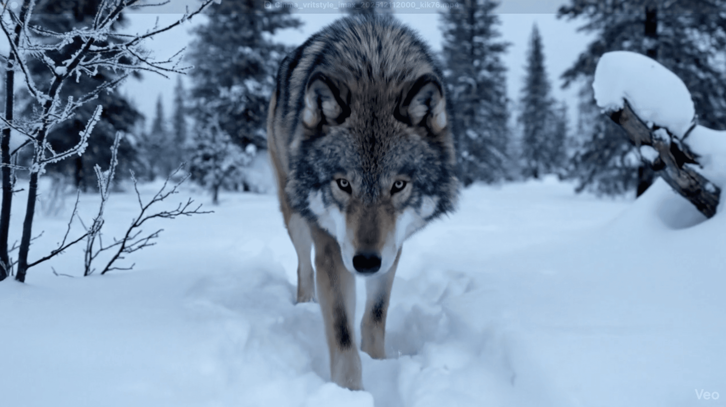 Use VEO, Sora, Runway to create cinematic lone gray wolf walking through a snow-covered forest, aerial perspective from 8K drone