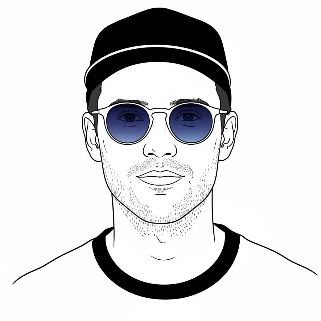 [reference image], hand-drawn minimalist monochrome portrait, white face with black outline features, solid black fill for baseball cap, solid black fill for visible hair, simplified facial features, pure white background, wearing black crew neck, distinctive blue gradient fill for round sunglasses (blue to light blue), subtle line variations suggesting hand drawing