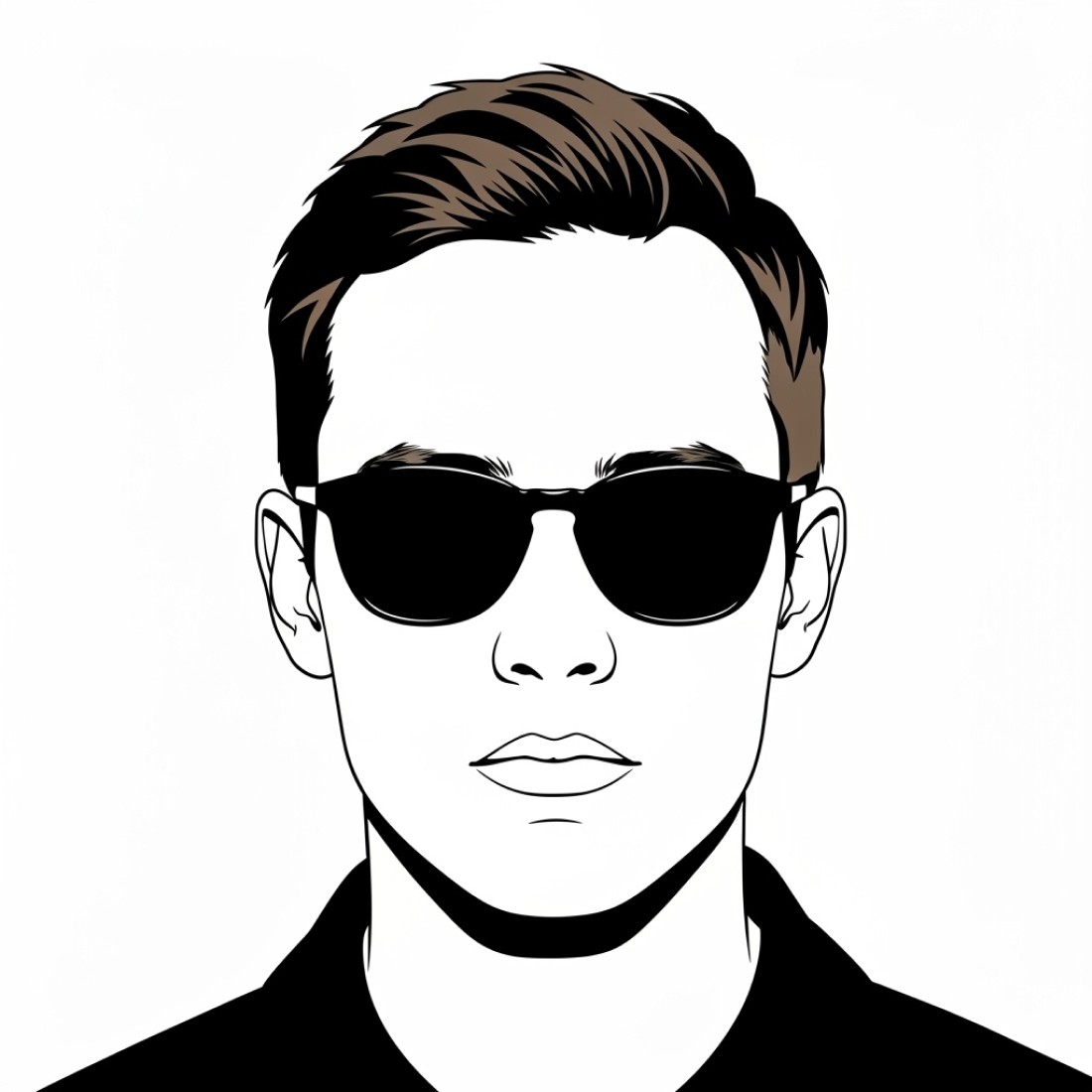 [reference image], minimalist forward-facing portrait, solid black hair, wearing dark sunglasses, clean black lines on white background, simple black collar showing, high contrast illustration style, cool contemporary look, minimal detail except for distinctive eyewear