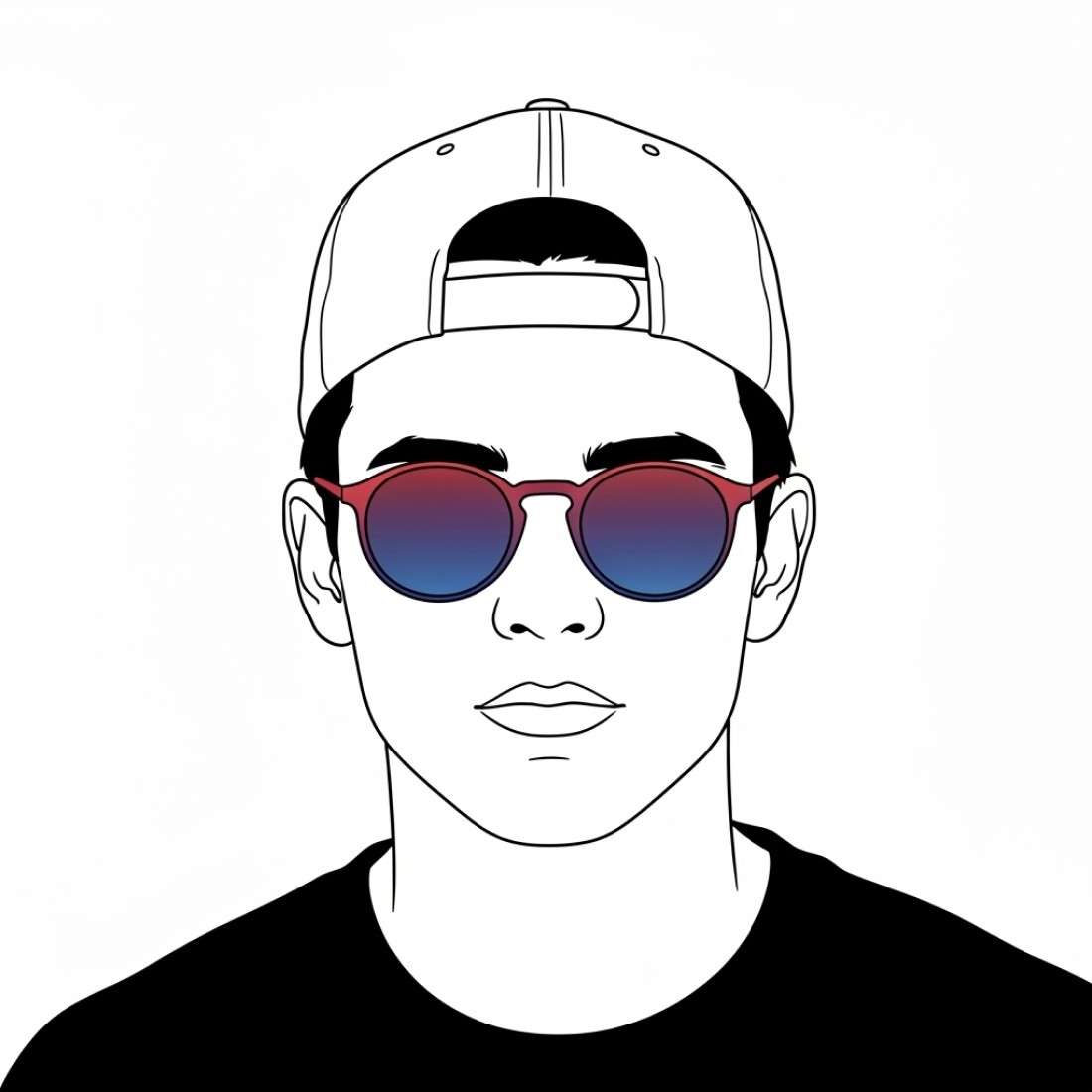 Use Google Imagen, Nano Banana, Midjourney & ChatGPT to create trendy minimalist avatars with red gradient sunglasses, white baseball caps, and clean hand-drawn styling on pure white backgrounds - perfect for music producers, creative directors, fashion industry, and contemporary cool digital identity