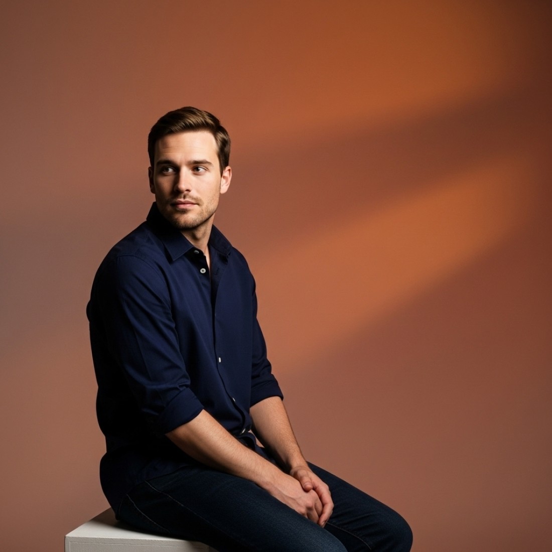 [reference image], studio shot with copper to amber gradient backdrop, navy shirt with rolled sleeves, perched sideways on white block, warm artistic tone, confident relaxed mood, soft shadow play, 50mm lens