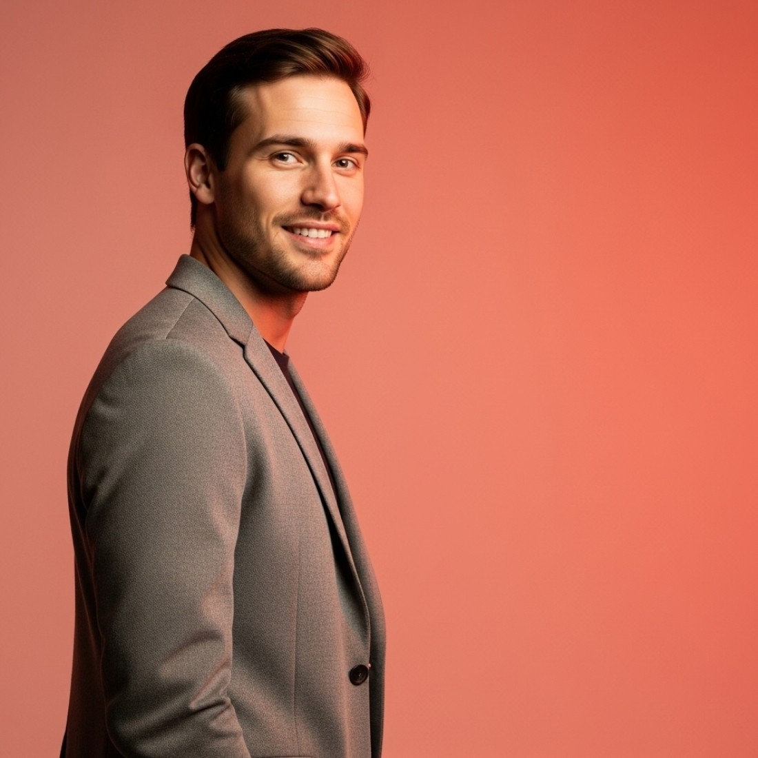 [reference image], professional portrait with vibrant coral and peach gradient studio background, grey tailored blazer, turning towards camera with confident smile, warm studio lighting, modern sophisticated aesthetic, three-quarter pose, contemporary business style, 85mm lens