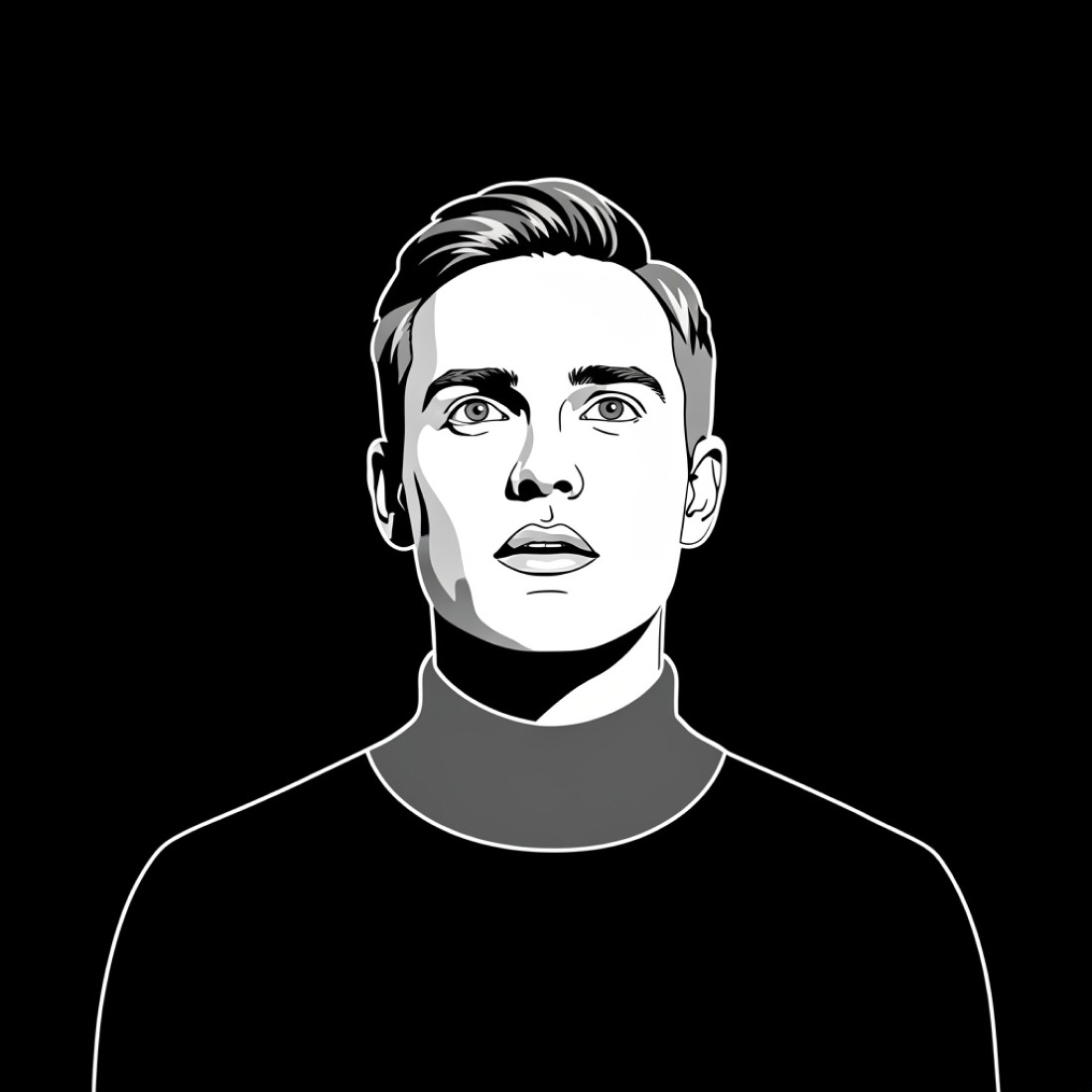 [reference image], hand-drawn minimalist portrait, solid black background, white outline for facial features, light gray fill for neat hair, two-tone turtleneck with dark gray base and lighter gray collar, upward gaze with slight wonder or curiosity, clean contrast