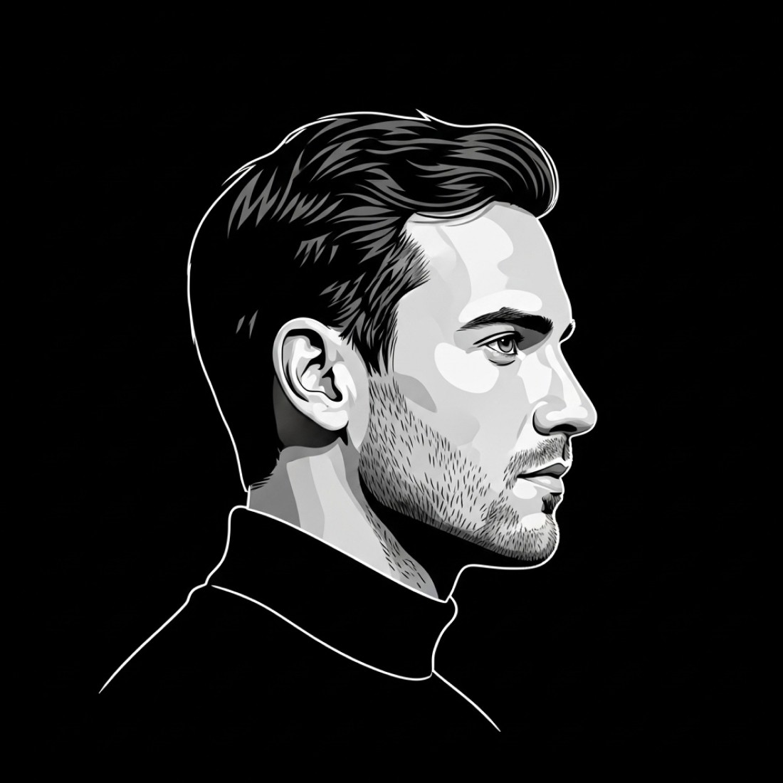 [reference image], hand-drawn minimalist portrait, solid black background, white outline for facial features, dark gray fill for side-swept hair, light gray turtleneck, complete profile showing distinctive nose and strong jawline, minimal approach with precise lines