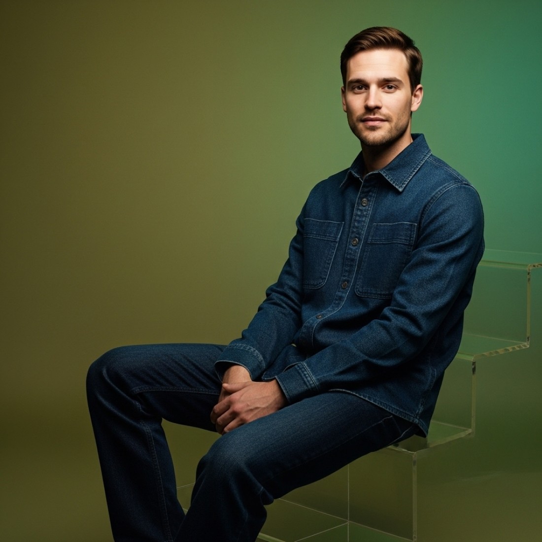 [reference image], portrait against emerald green to jade gradient studio background, dark denim overshirt, sitting casually on clear acrylic step, confident relaxed posture, lush tones with clean modern depth, 85mm lens