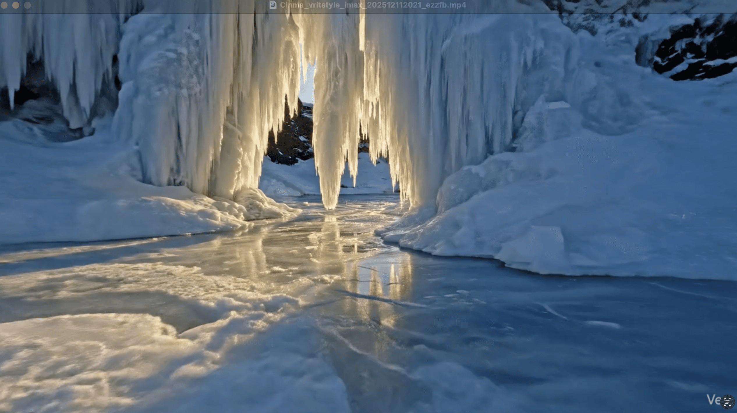 Use VEO, Sora, Runway to create cinematic video IMAX footage of a massive waterfall frozen mid-motion, ice crystals glistening in golden hour sunlight