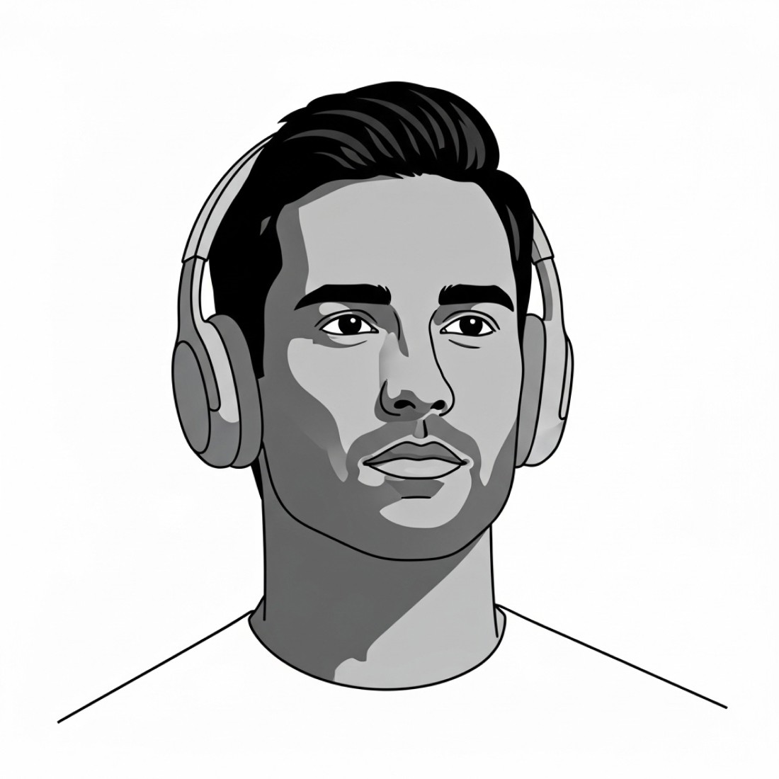 [reference image], minimalist portrait illustration, medium gray fill for face and neck, solid black hair with textured top, clean line art style, simplified facial features, white background, wearing light gray wireless headphones, diagonal view showing partial face from upper right angle, contemporary tech-focused minimal design