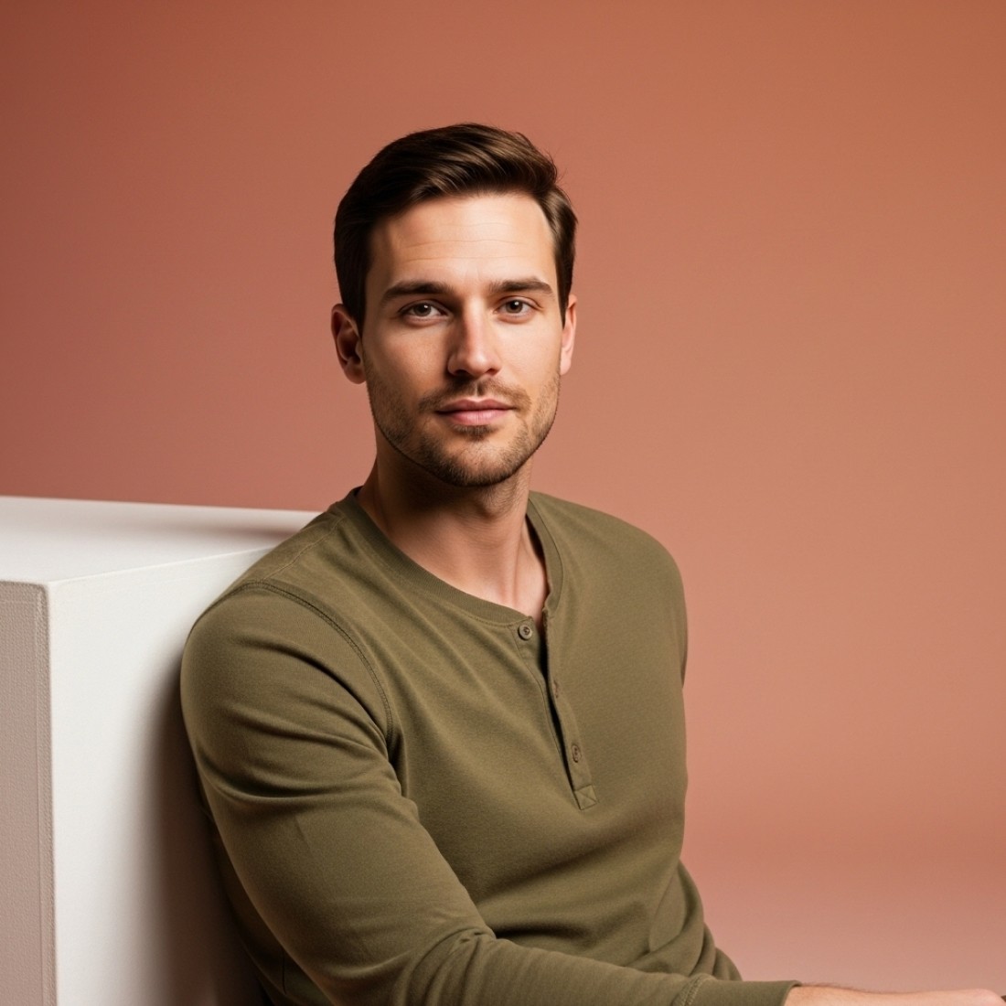[reference image], portrait against warm terracotta to salmon gradient studio background, olive green henley, sitting on floor leaning against white cube, grounded authentic feel, earthy sophisticated palette, natural relaxed mood, 85mm lens