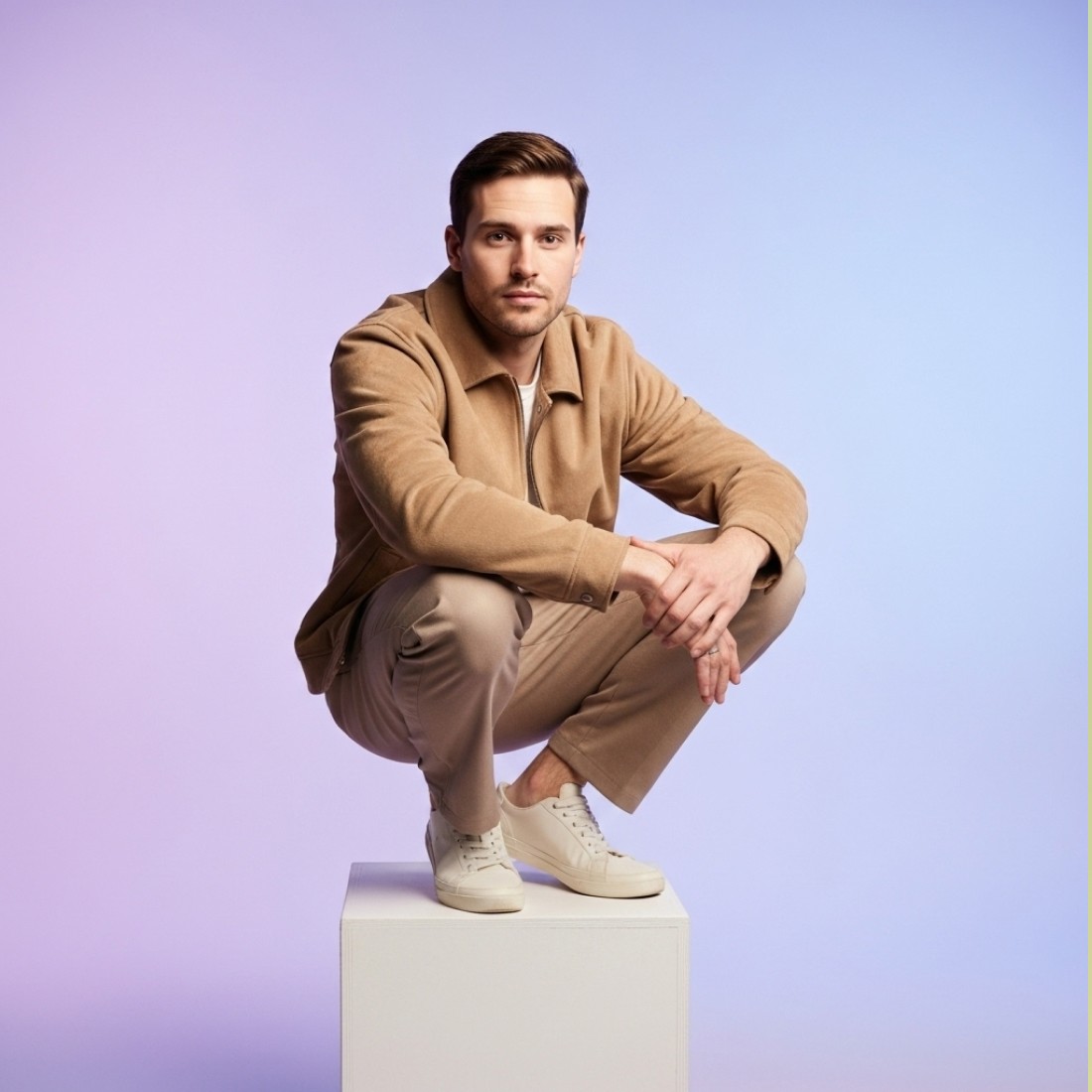 [reference image], portrait against lavender to lilac gradient studio background, tan suede jacket, crouching position on white box, hands clasped between knees, soft pastel mood, creative posing, approachable artistry, 85mm lens