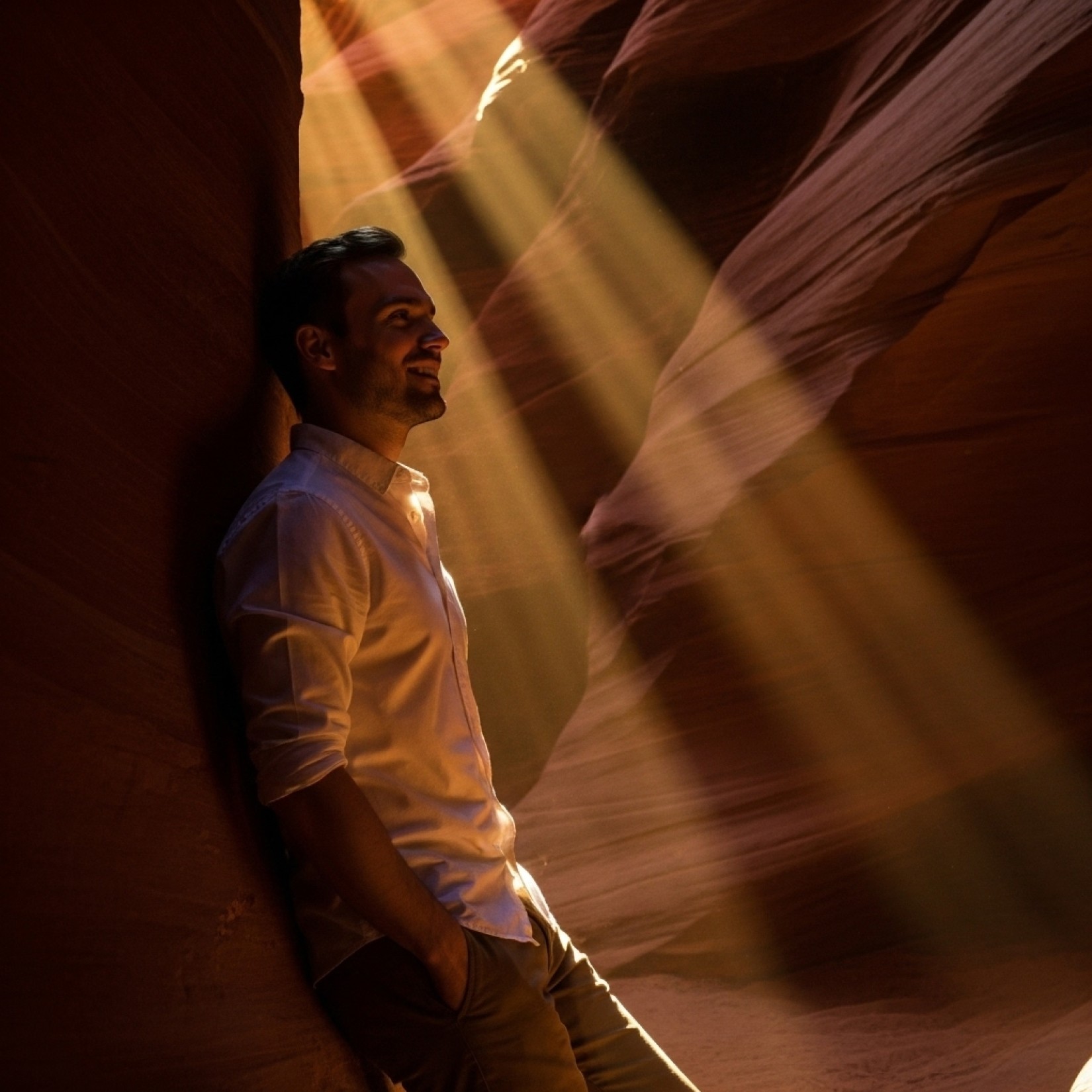 [Reference image], relaxed male model leaning casually against Antelope Canyon wall, wearing white button-down and chinos, genuine natural smile with golden light beams flowing past, magical canyon atmosphere, sculptural sandstone dating photography