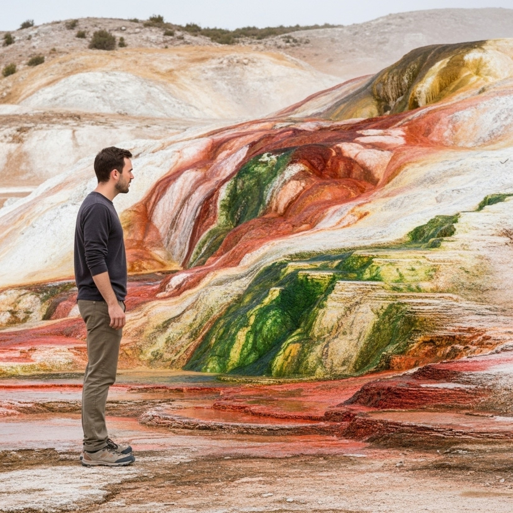 [Reference image], curious male model near Fly Geyser Nevada, wearing desert casual wear, fascinated expression with colorful mineral formations, surreal geothermal landscape, alien-like natural structures dating photography
