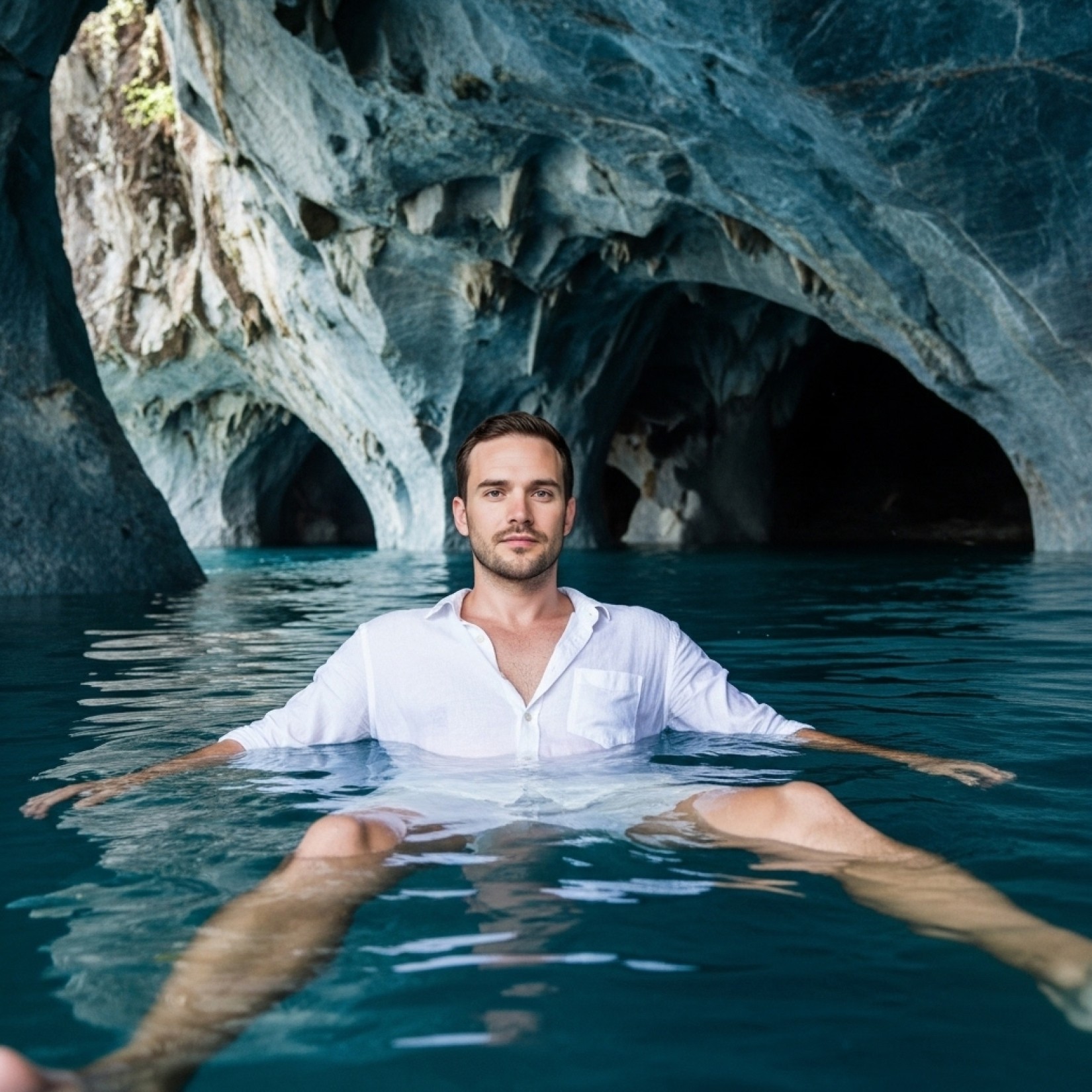 [Reference image], relaxed male model floating peacefully in Marble Caves Chile, wearing white linen shirt and swim shorts, calm natural expression while drifting through blue marble formations, ethereal water lighting, sculptural cave walls dating photography