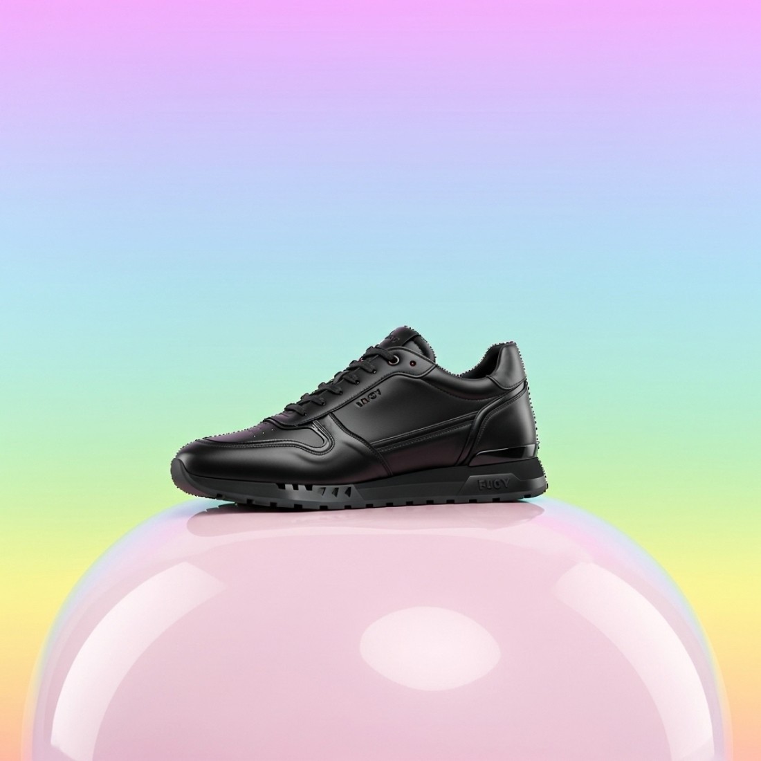 [Reference image], men's sneaker on bright mint green acrylic box, vibrant gradient from coral to golden yellow, island paradise presentation, high-end resort campaign style