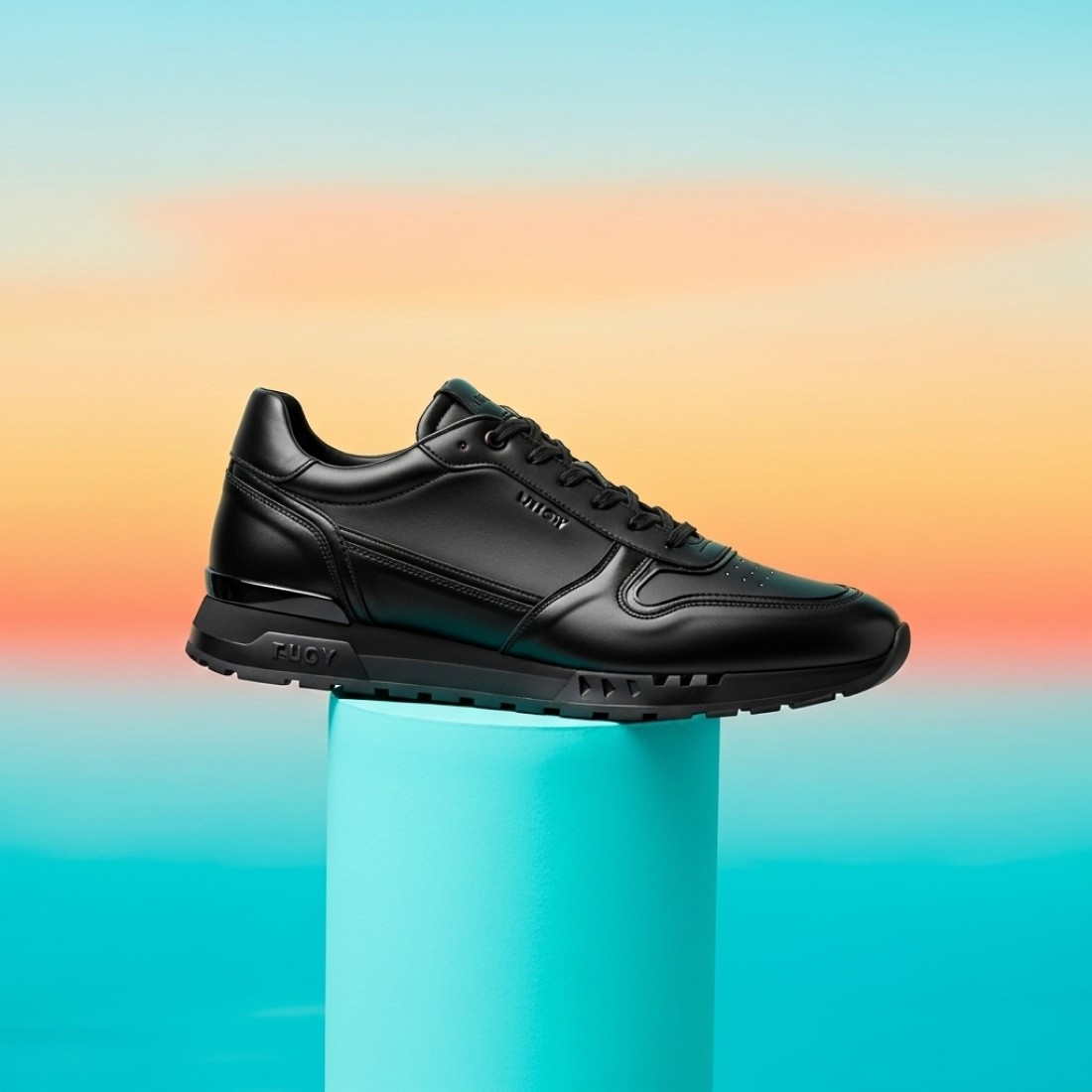 [Reference image], men's sneaker on electric blue geometric platform, hot magenta and cyan gradient walls, Japanese street fashion vibe, bold neon lighting effects