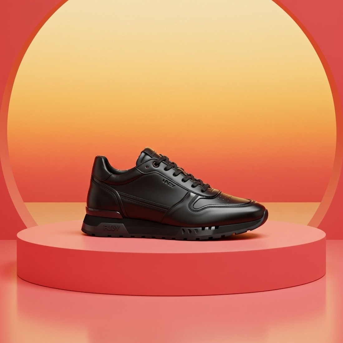 [Reference image], men's sneaker on glossy bubblegum pink pedestal, rainbow gradient background from lavender to bright yellow, playful aesthetic, contemporary fashion campaign energy