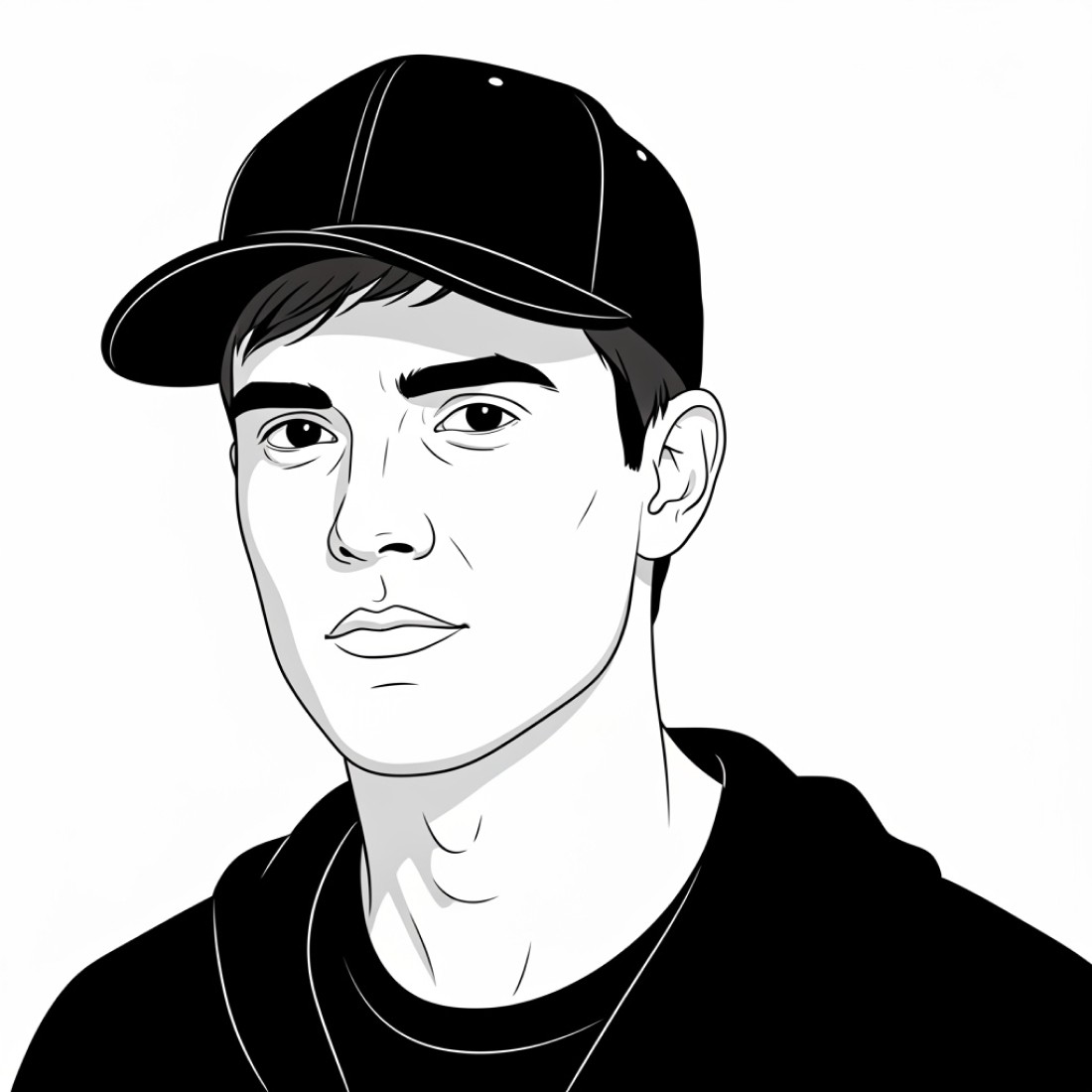 [reference image], minimalist portrait wearing baseball cap, solid black cap with hair showing beneath, clean line illustration style, simplified facial features, white background, wearing black t-shirt/hoodie, contemporary casual style, high contrast monochrome
