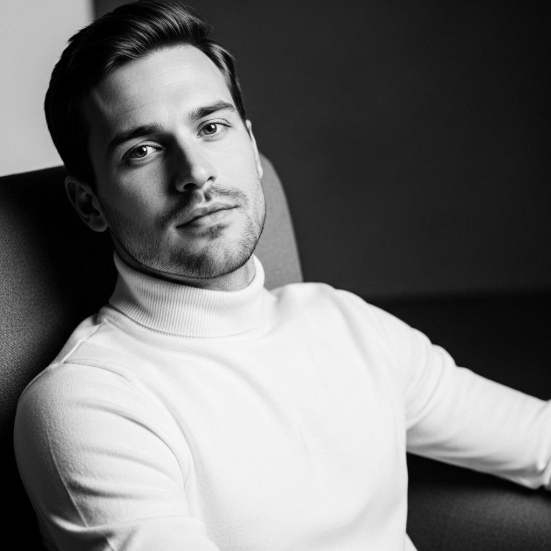 [reference image], black-and-white mid-shot of the same man wearing a white cashmere turtleneck sweater, seated leaning back on chair, head tilted toward light source, soft highlight contouring, modern editorial restraint, 85mm lens
