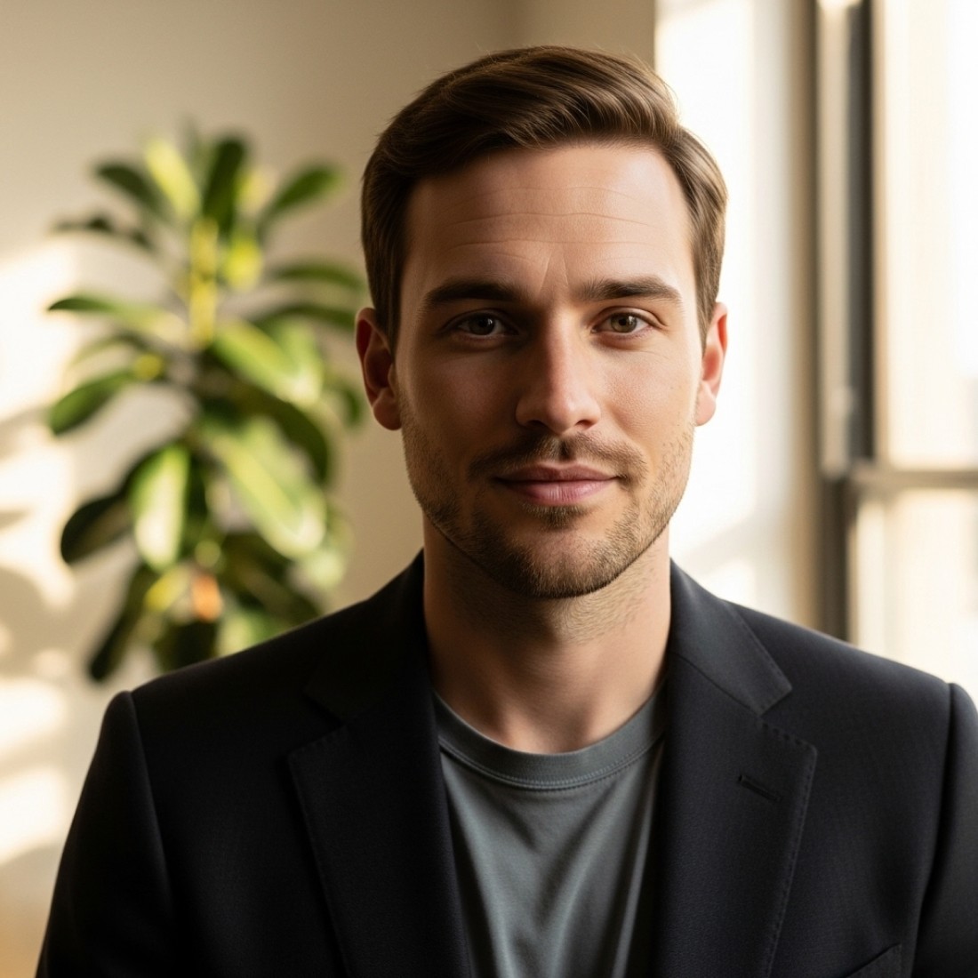 [reference image], cinematic ultra-realistic portrait of the same man, wearing a dark blazer and plain T-shirt, photographed in a modern minimal office with warm natural window light and large plant, confident and calm expression, shallow depth of field, bokeh background, premium lens aesthetic, realistic skin detail, professional editorial style