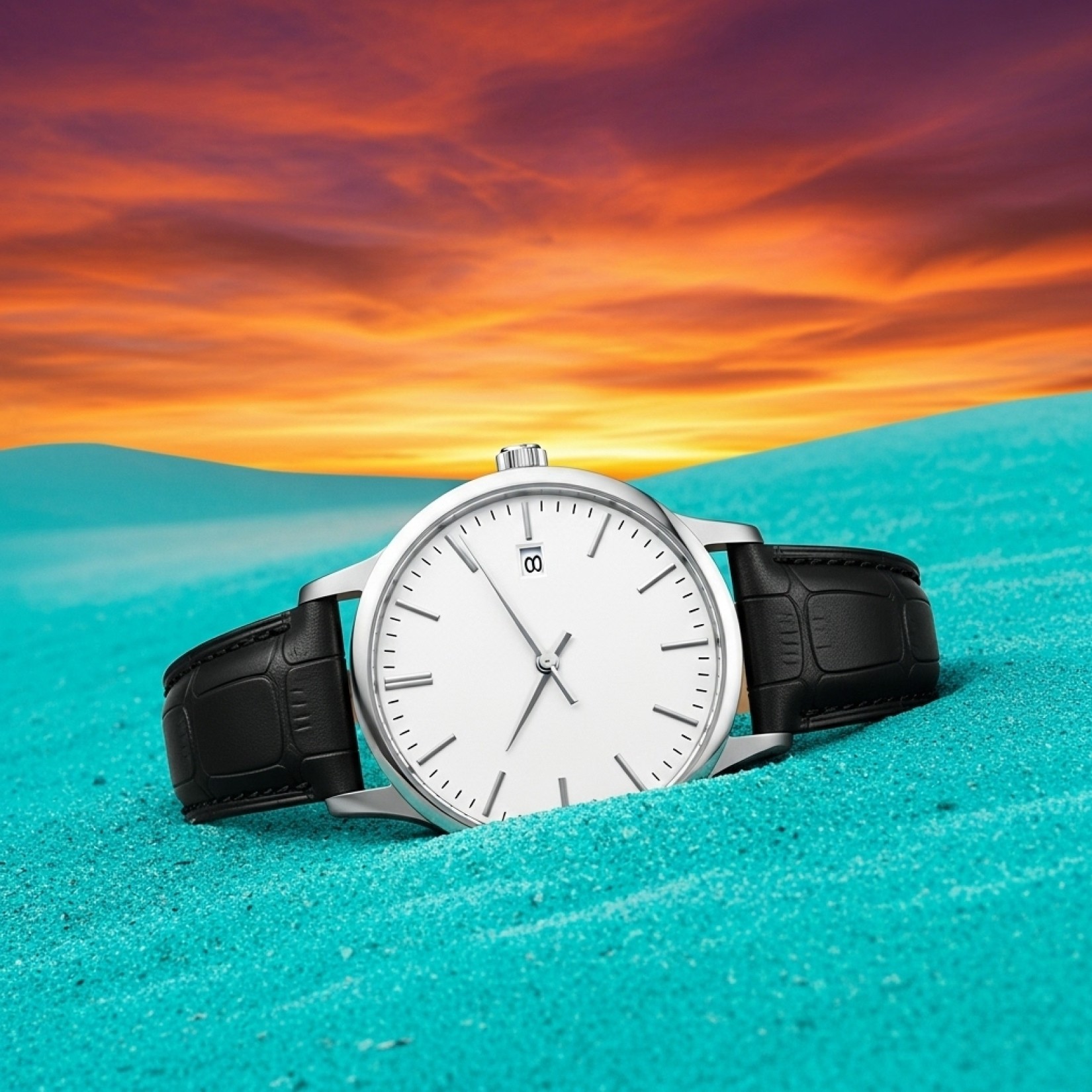 Use Google Imagen, Nano Banana, Midjourney & ChatGPT to create underwater product watch photography with coral reef surfaces, crystal clear turquoise water, aquatic presentation - perfect for underwater lifestyle campaigns, aquatic timepiece marketing, commercial photography, and AI-generated product images seeking marine luxury aesthetics