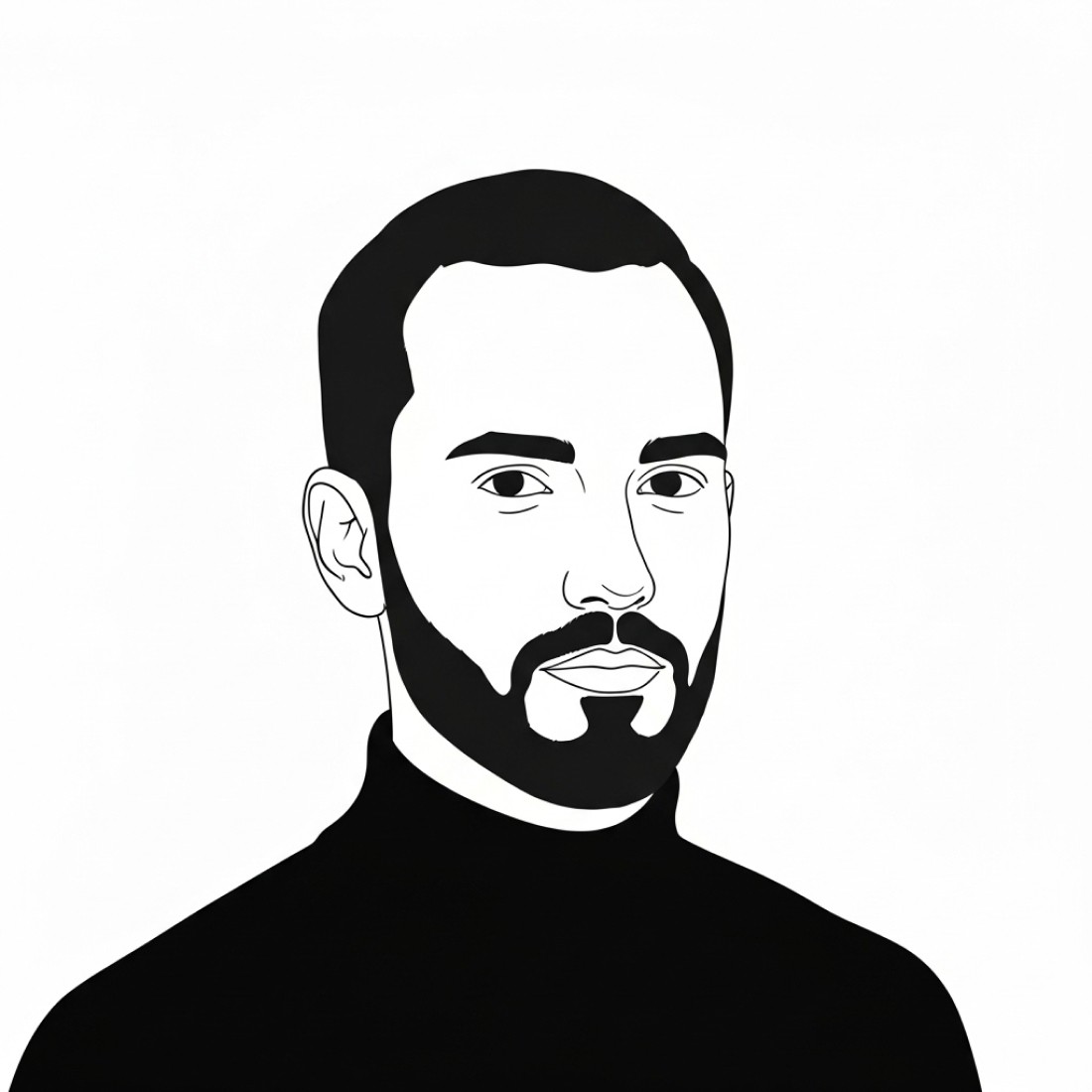 [reference image], minimalist portrait illustration, white face with clean outlines, solid black beard and hair, simplified facial features, white background, wearing black turtleneck, three-quarter view, contemporary clean line style