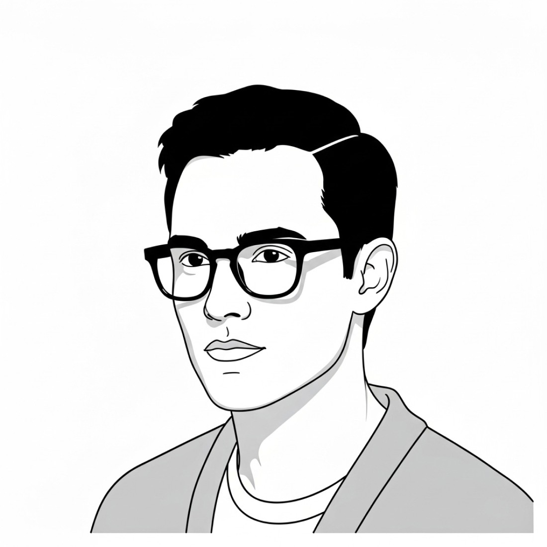 [reference image], minimalist monochrome portrait illustration, white face with clean black outlines, solid black hair with neat side part, simplified facial features, white background, wearing light gray cardigan over white t-shirt, black rectangular glasses, three-quarter view angle, clean contemporary illustration style