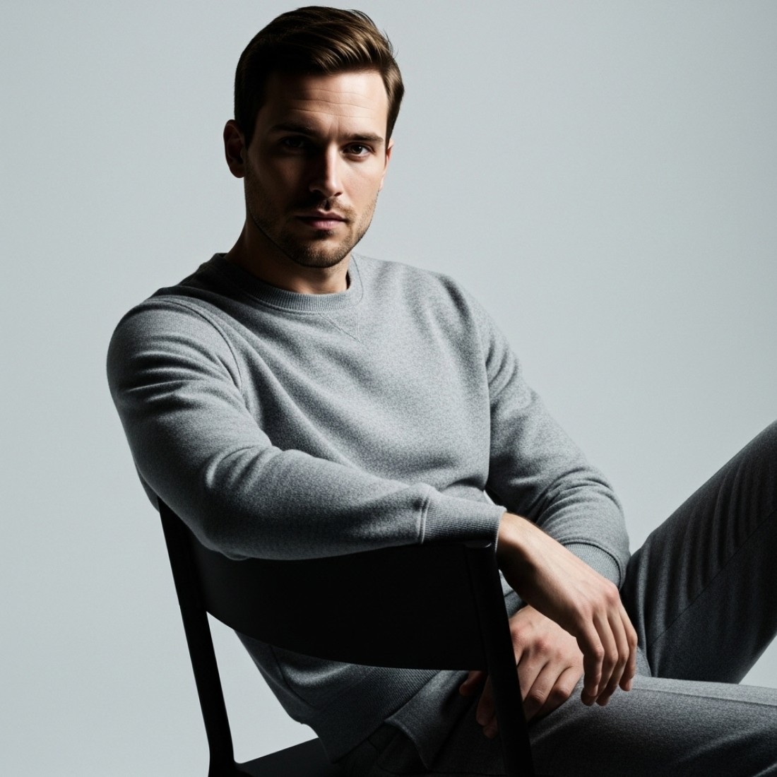 [reference image], create an editorial shot, inspired by Saint Laurent advertising shots. Abstract angle, intense gaze. Sitting on minimalist black chair. Wearing grey tailored cashmere sweatshirt, grey cashmere trousers. Relaxed sitting position. Light grey background.