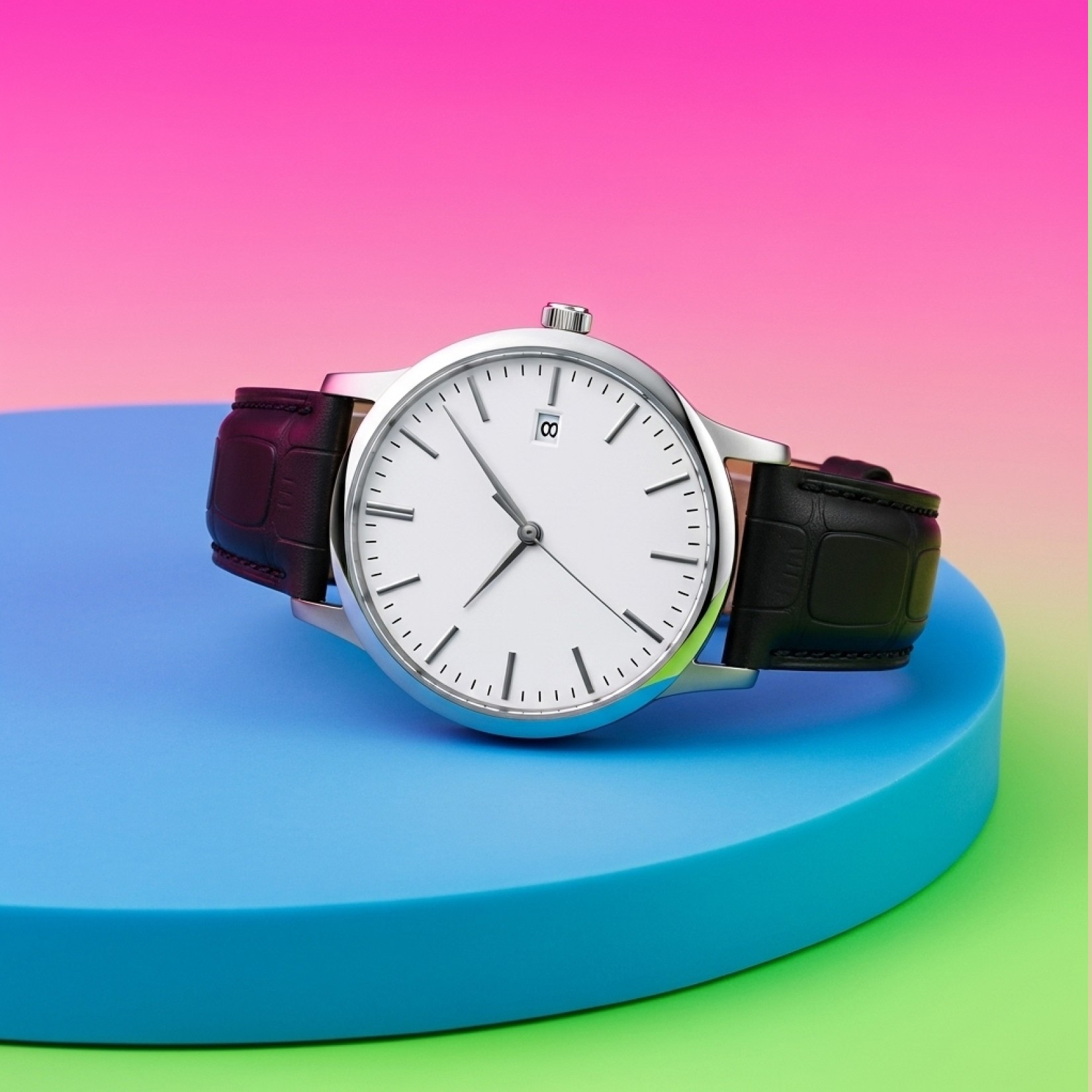 [Reference image], silver watch with black leather strap on bright electric blue circular platform, hot pink and lime green gradient backdrop, neon lighting creating colorful reflections on metal case, contemporary tech aesthetic