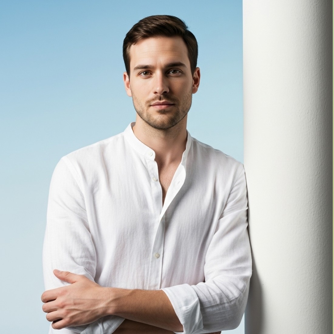 [reference image], portrait against sky blue to powder blue gradient studio background, white linen shirt, standing with arms folded leaning against white column, fresh airy sophistication, bright even lighting, Mediterranean cool, 85mm lens
