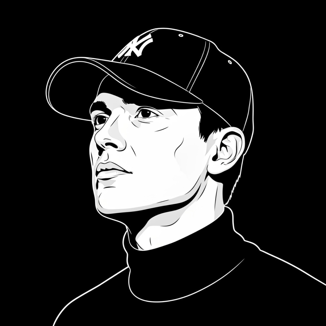 [reference image], hand-drawn minimalist portrait, solid black background, white outline for facial features, black baseball cap with white logo detail, black turtleneck creating seamless silhouette, profile with slight upward tilt, strategic white elements creating visual interest