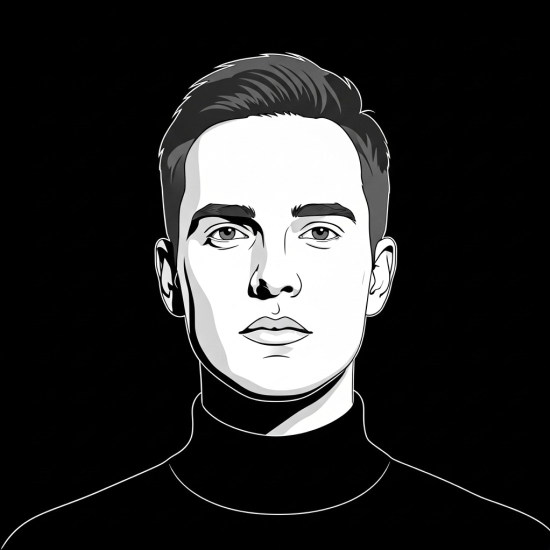 [reference image], hand-drawn minimalist portrait, solid black background, white outline for facial features, medium gray fill for short hair, charcoal gray turtleneck, dynamic upward angle view showing underside of jaw, clean contrast with minimal lines