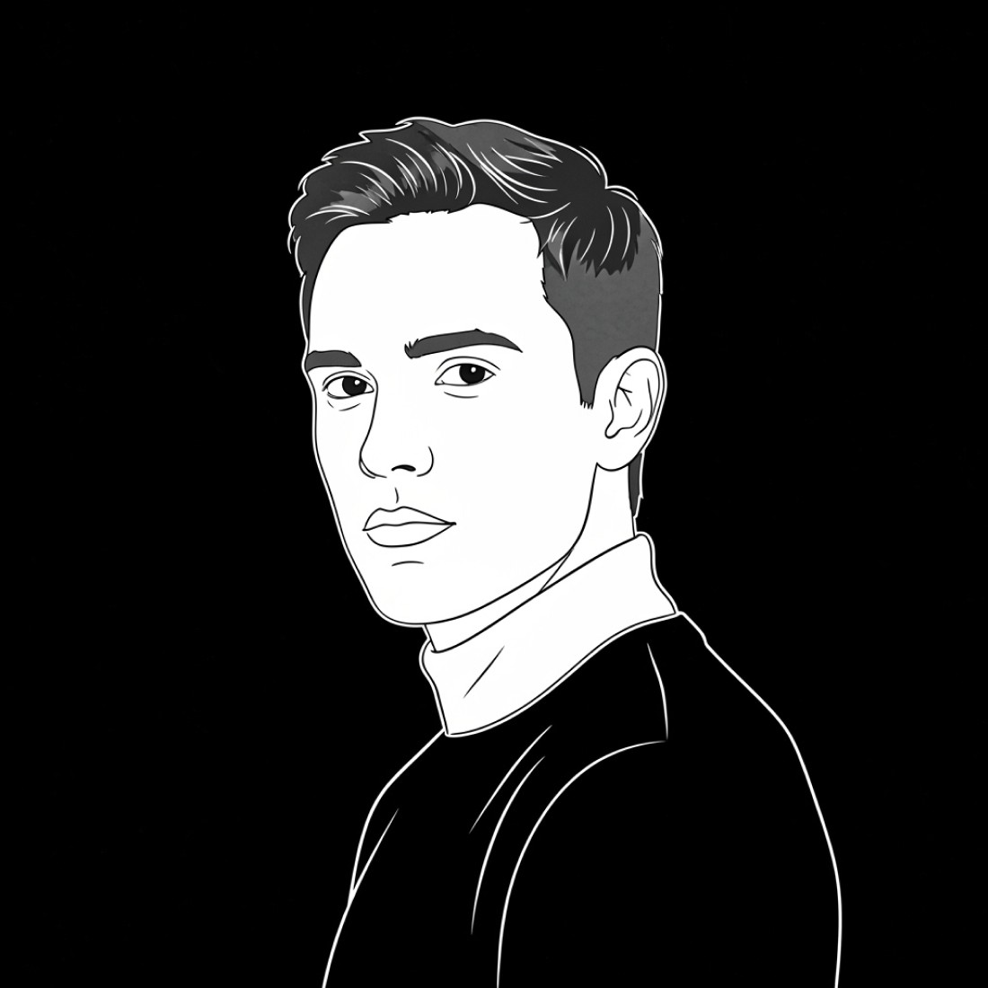 [reference image], hand-drawn minimalist portrait, solid black background, white outline for facial features, medium gray fill for textured hair, white turtleneck creating stark contrast, dynamic pose catching a quick side glance, minimal yet expressive line work