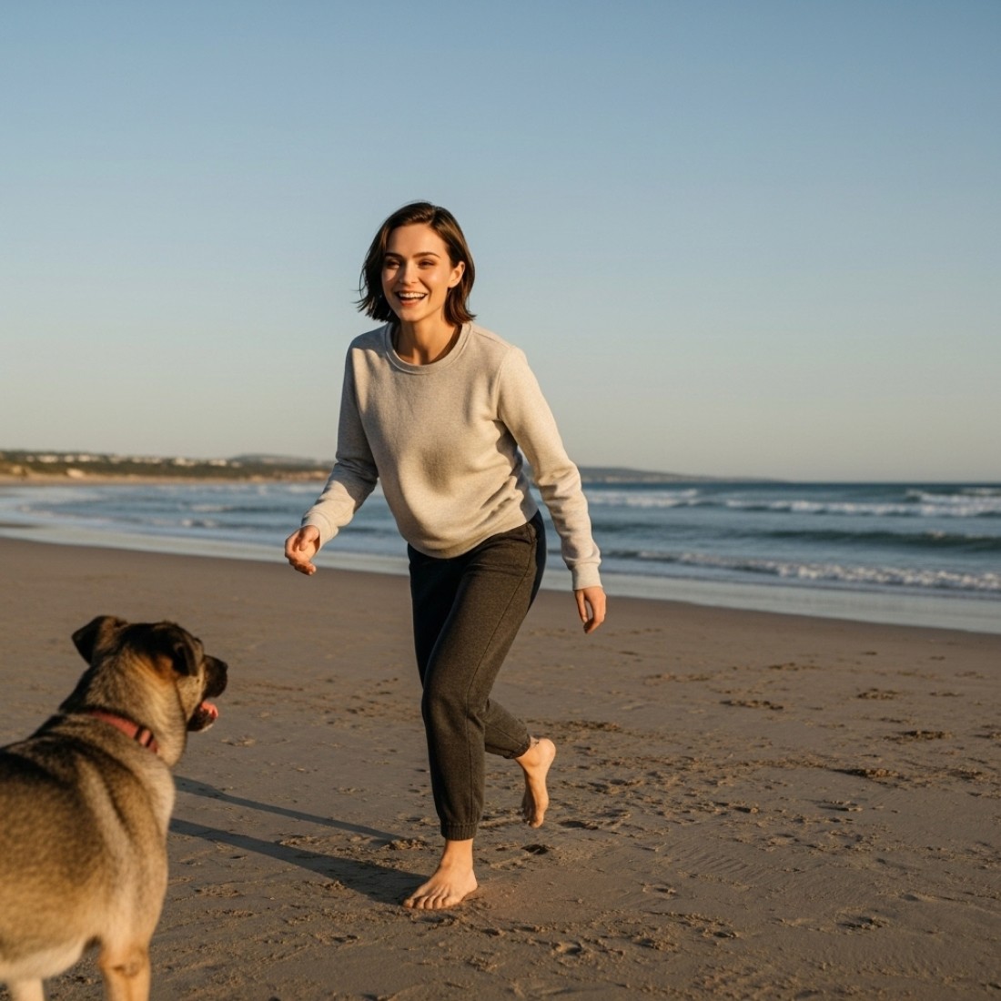 [Reference image], active female model playing fetch with dog on beach, wearing athletic casual wear, dynamic movement and laughter, natural beach lighting, sandy coastline background, pet-loving dating photography