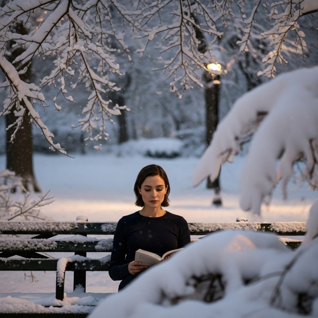 Use Google Imagen, Nano Banana, Midjourney & ChatGPT to create contemplative women's dating profile photos reading on snowy Central Park benches with warm winter clothing, thoughtful expressions, peaceful winter solitude moments - perfect for dating app profiles, intellectual lifestyle content, winter contemplation photography, and AI-generated dating images seeking serene reading aesthetics