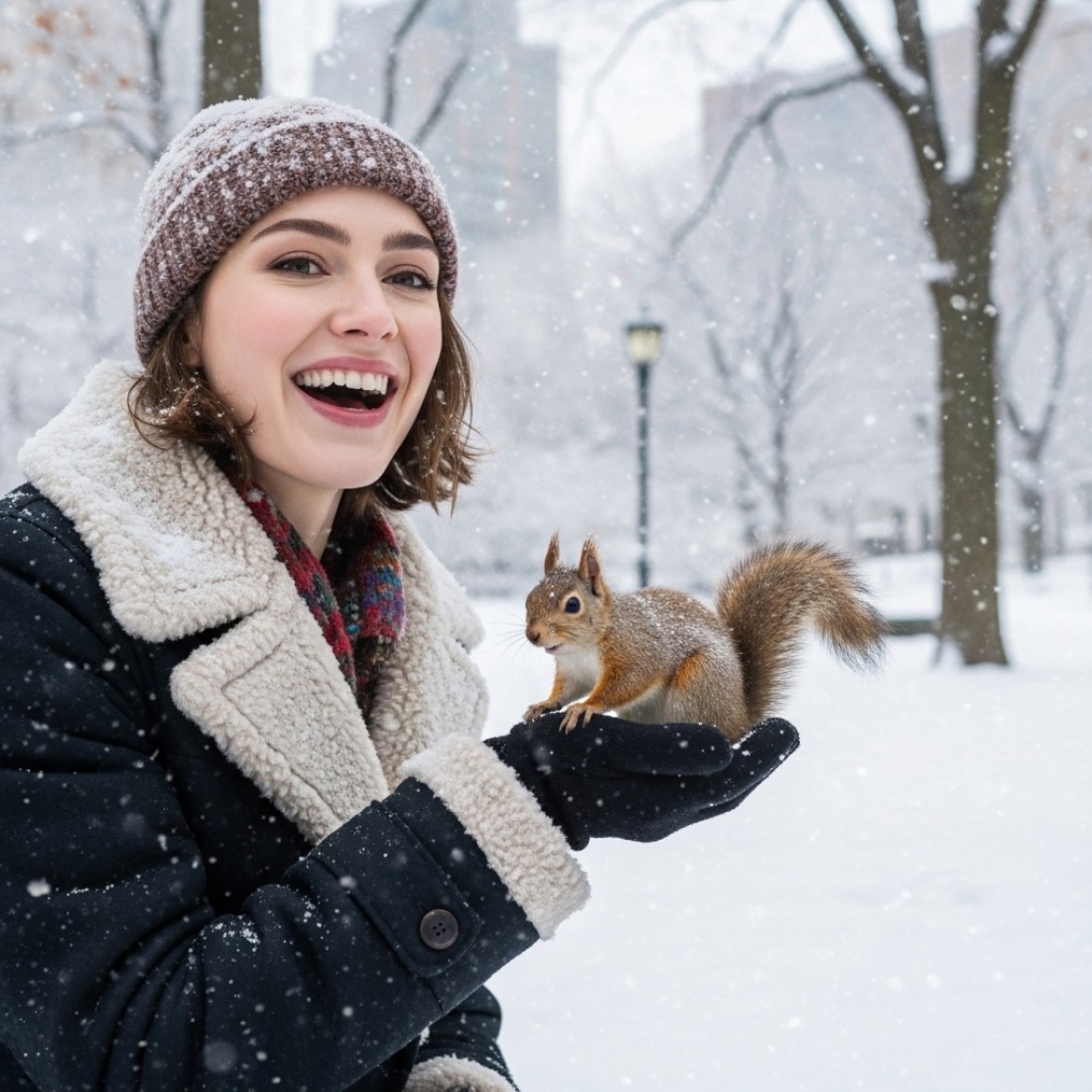 Use Google Imagen, Nano Banana, Midjourney & ChatGPT to create delighted women's dating profile photos feeding squirrels in snowy Central Park with cozy winter coats, genuine laughter, magical urban wildlife moments - perfect for dating app profiles, winter lifestyle content, urban nature photography, and AI-generated dating images seeking heartwarming animal interaction aesthetics