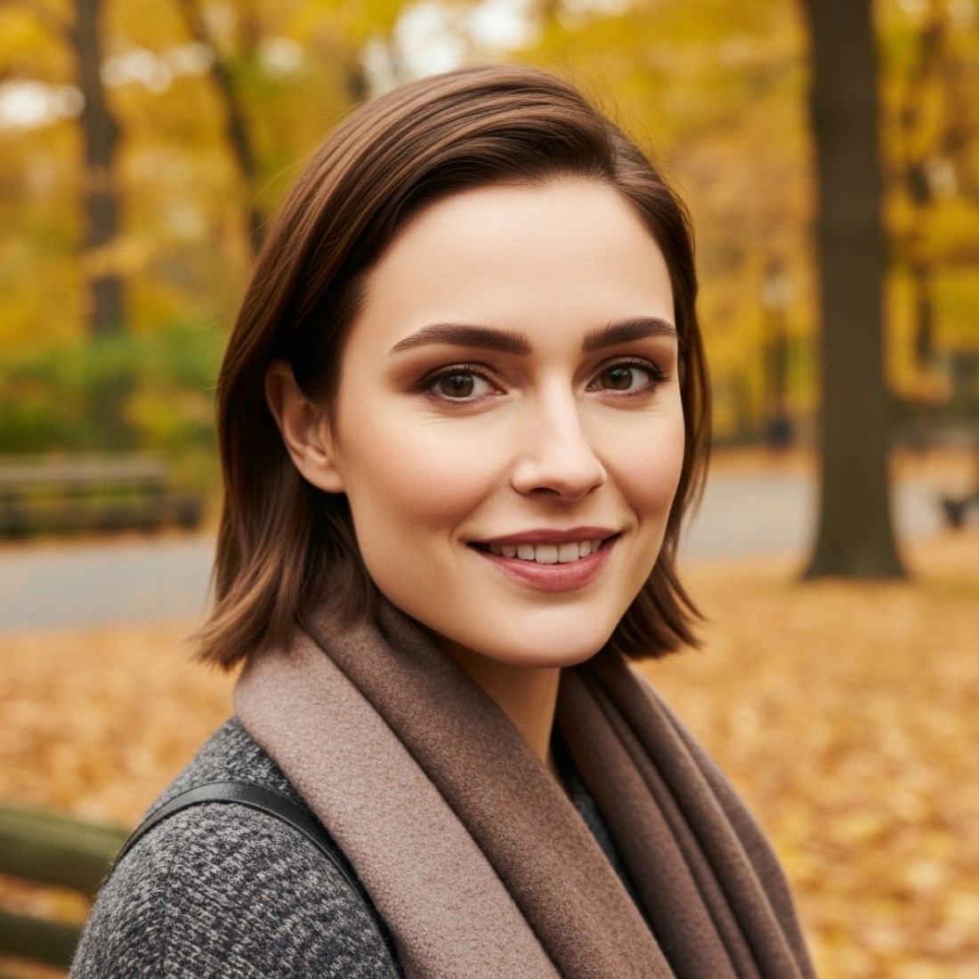 [Reference image], serene female model in Central Park New York during autumn, wearing cozy sweater and scarf, genuine smile surrounded by golden fall foliage, natural park lighting, urban nature dating photography