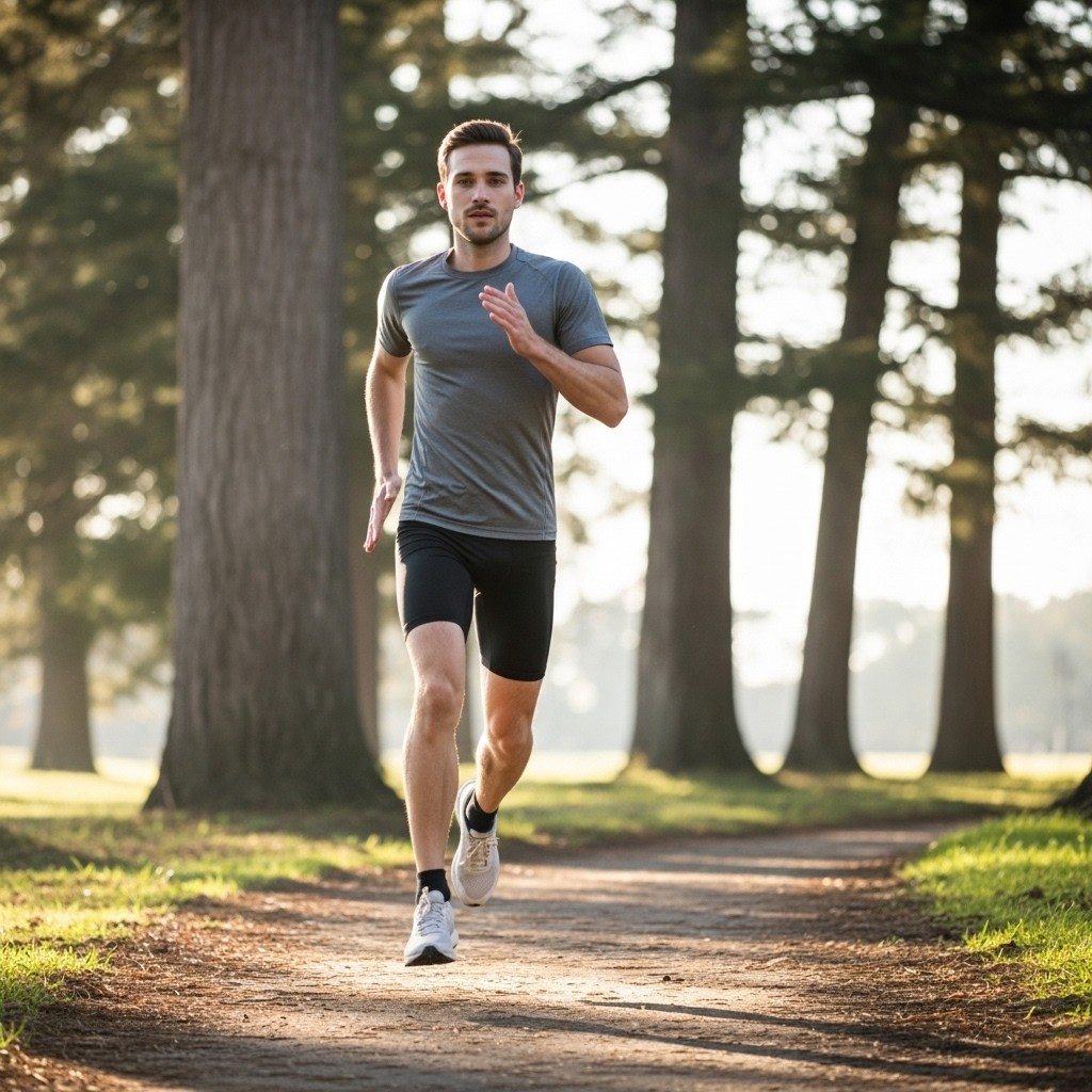 "Full-body action shot of male model jogging on park trail, natural morning light, athletic wear including fitted running shirt and shorts, running shoes, natural running form mid-stride, outdoor park setting, energetic healthy appearance, authentic athletic moment, trees blurred in background"
