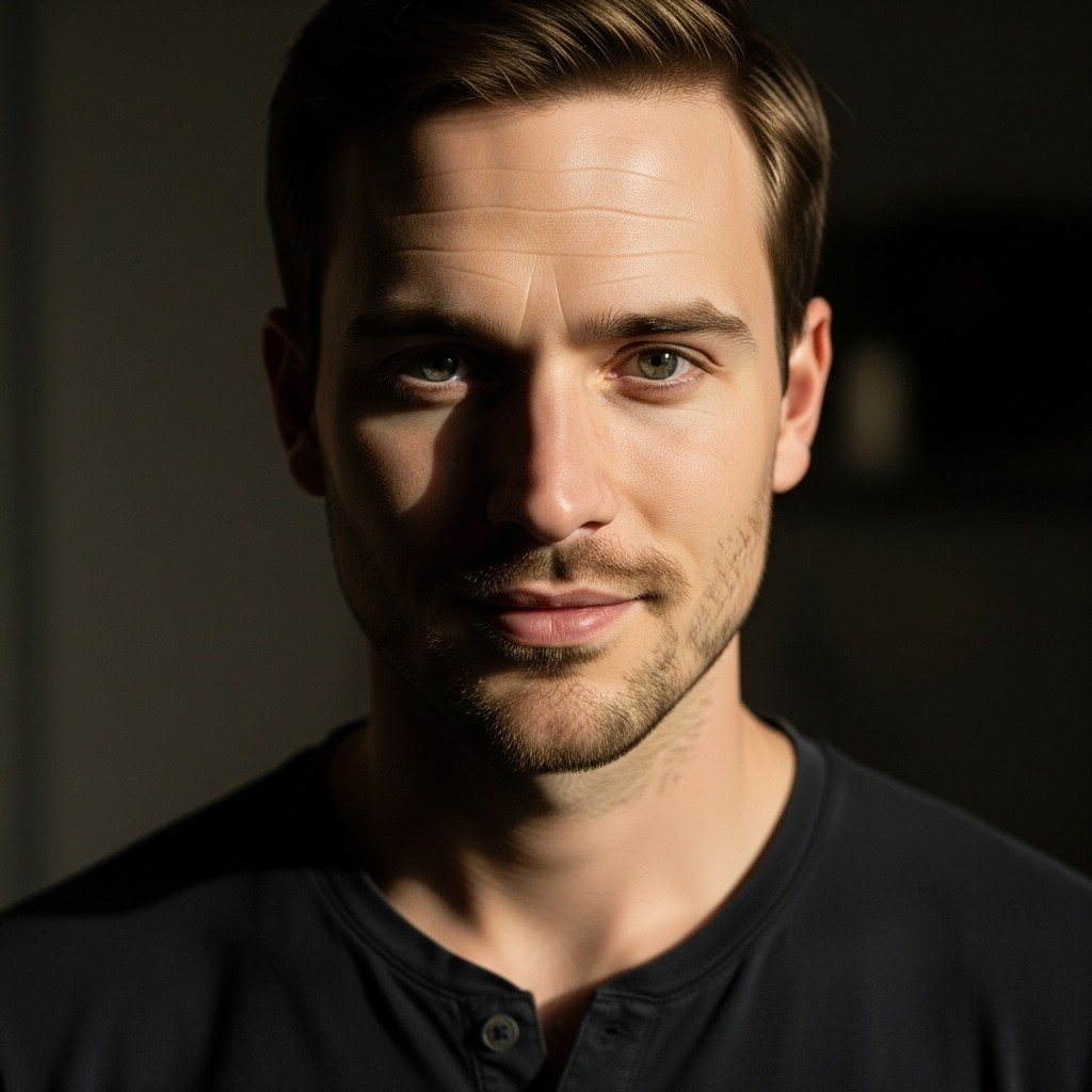 "Headshot of male model with dramatic side lighting, strong light from one side creating defined features, confident subtle smile, dark henley shirt, dark blurred background, mysterious yet approachable expression, strong eye contact, editorial photography style"
