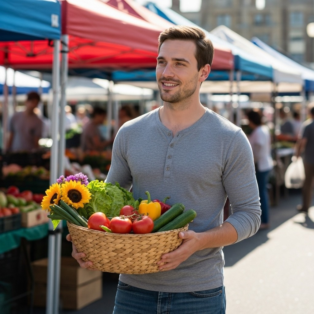 Full Prompt: "Male model at outdoor farmer's market, holding basket with fresh vegetables and flowers, wearing casual henley and jeans, genuine friendly smile interacting with vendors, colorful market stalls in background, warm sunny day, approachable community-minded vibe, authentic lifestyle moment"